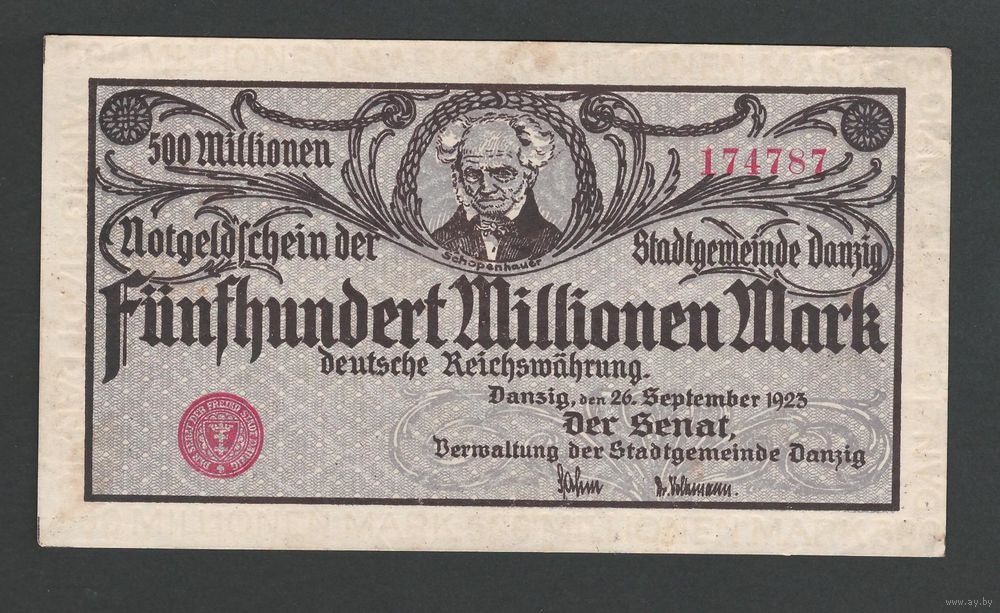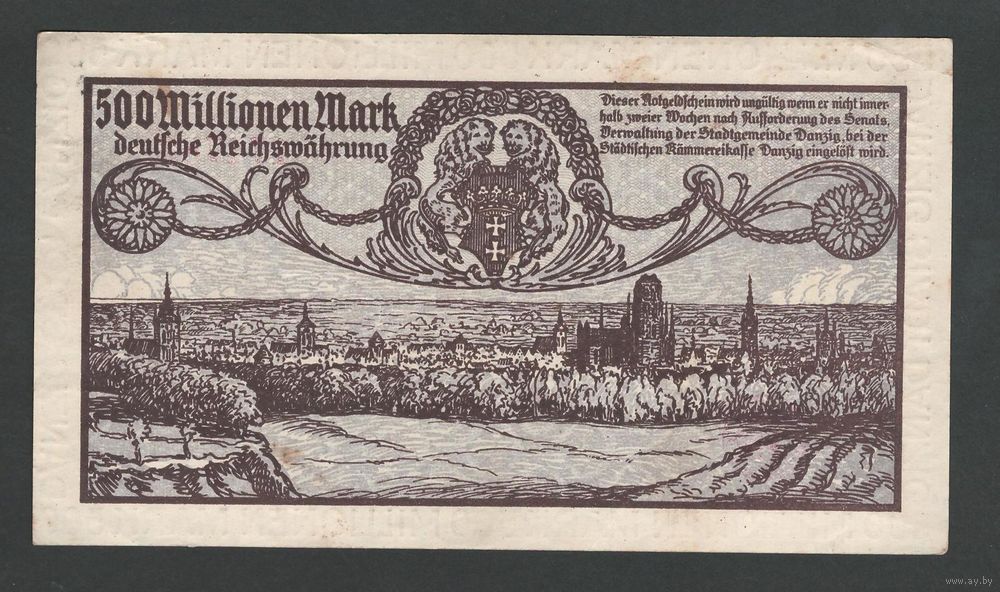 Данциг 500000000 марок 1923 года. Тип Р-28b. Состояние aUNC