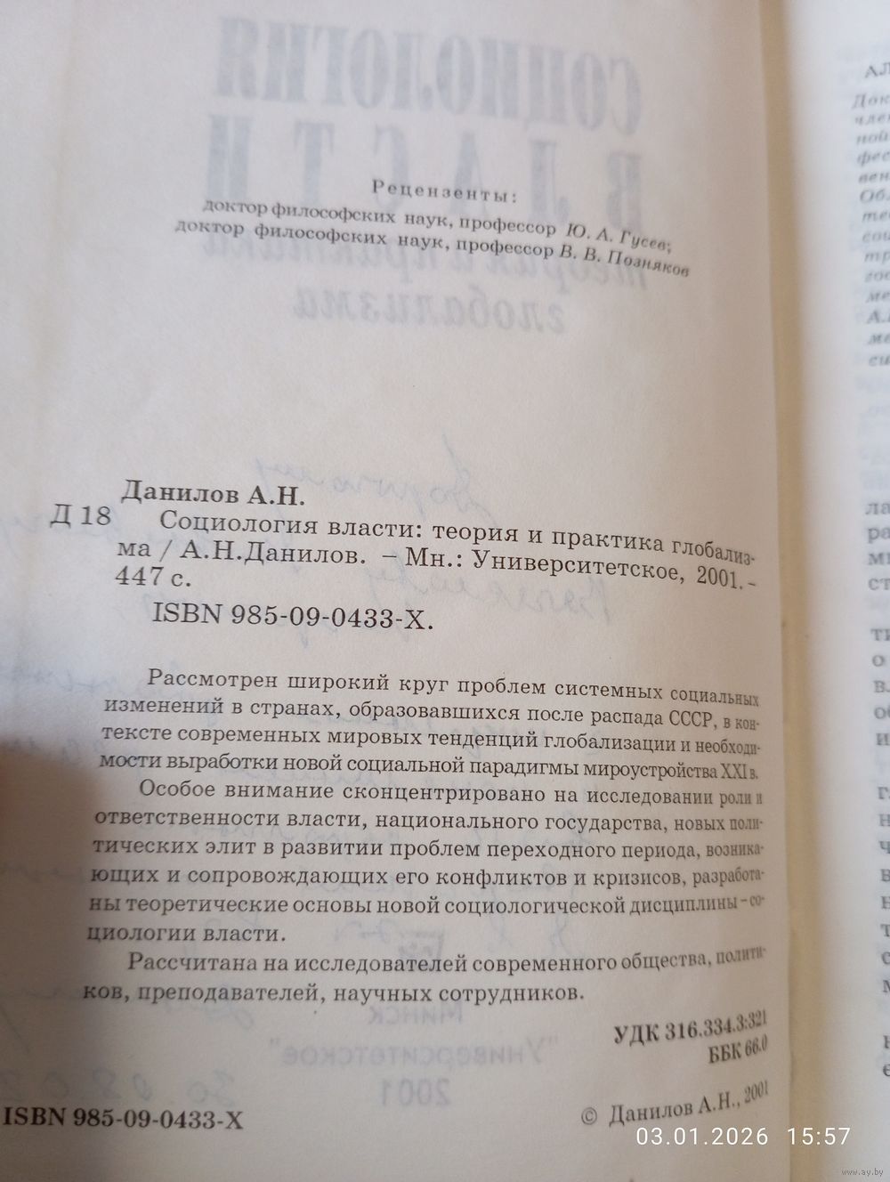 Данилов А. Социология власти. Теория и практика глобализма. Редкая. С автографом. Мн. Университетское 2001. В прекрасном состоянии, тв переплет. 447 с. Тираж 1000(!). Возможность отправки Белпочтой, полная предоплата на карту Беларусбанк