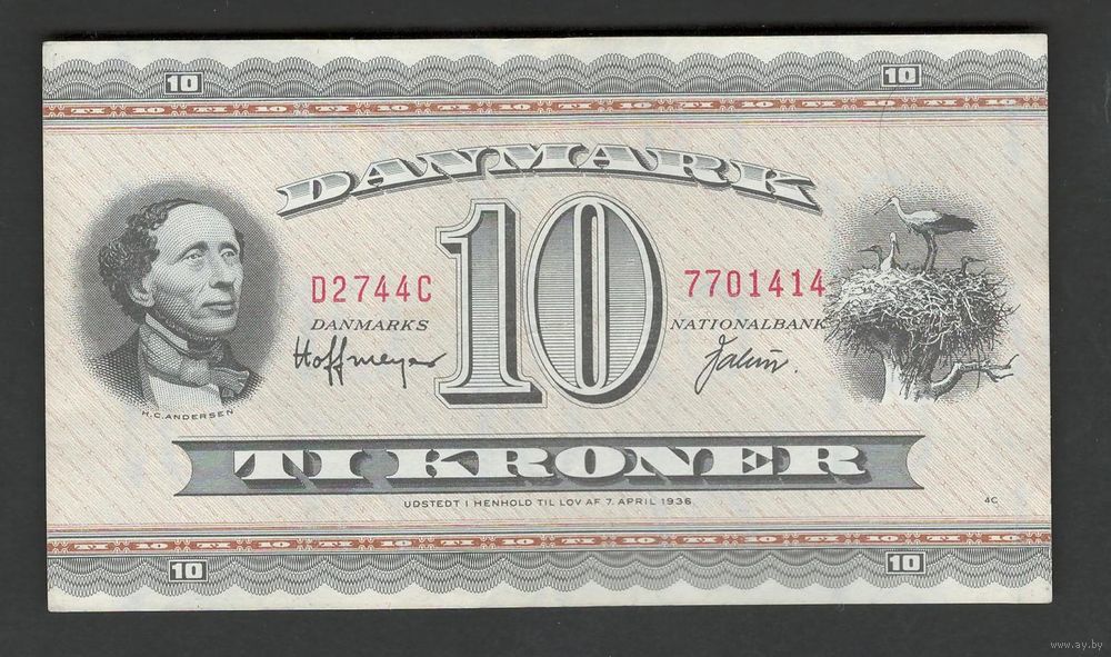 Дания 10 крон образца 1954 года. Тип Р-44ai(2). Состояние XF