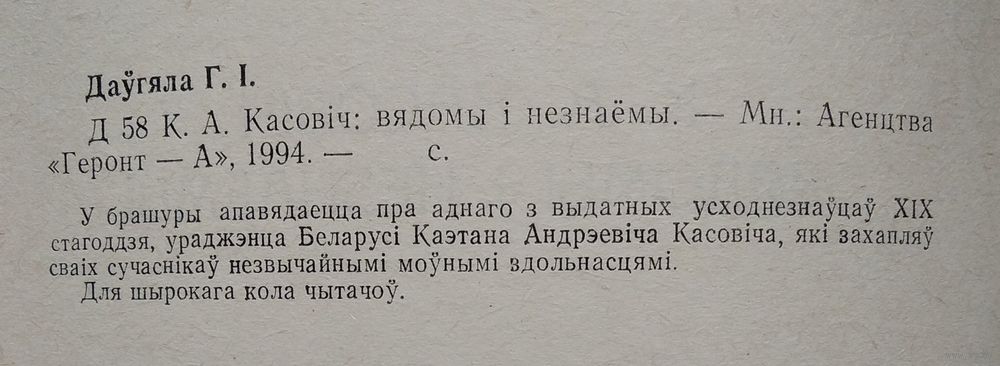 Даўгяла, Г. І. К.А.Касовіч: вядомы і незнаёмы. Мн.: Агенцтва "Геронт - А", 1994 г. 20 с. Мяккая вокладка.