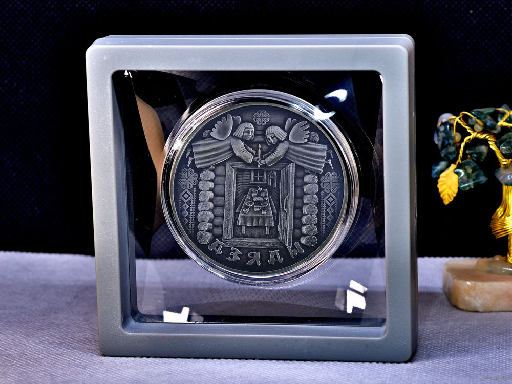 в центре – изображен интерьер деревенской хаты, в которой накрыт стол для поминовения усопших; вверху – над входом в хату два ангела держат свечу (на серебряной монете вставка из синтетического кристалла оранжевого цвета имитирует пламя); слева, справа и вверху – рельефные элементы белорусского национального орнамента с мотивами Души; внизу по кругу надпись: ДЗЯДЫ.