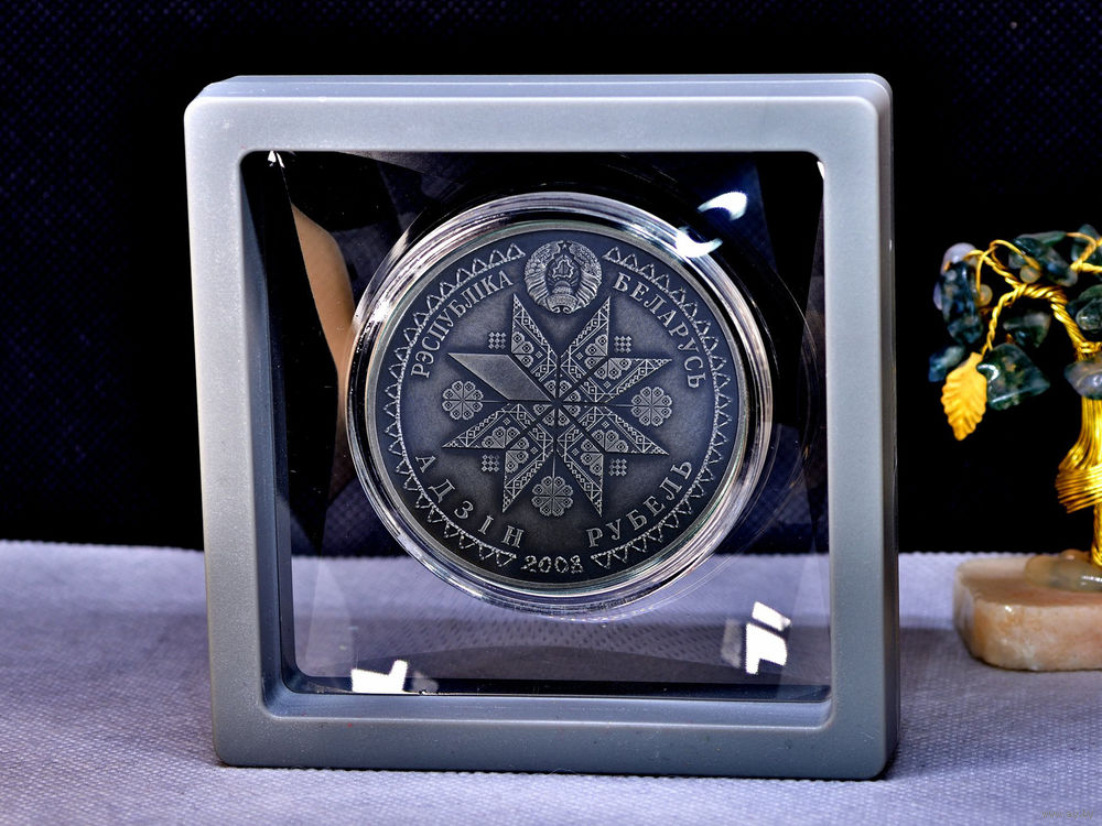 в круге, обрамленном геометрическим орнаментом, – рельефное изображение Государственного герба Республики Беларусь; в центре – солярный знак, состоящий из восьмиконечной геометрической фигуры с элементами декора, символизирующий солнечные лучи; под ним указаны: год чеканки, на серебряной – проба сплава; по кругу надписи: в верхней части – РЭСПУБЛІКА БЕЛАРУСЬ, в нижней – ДВАЦЦАЦЬ РУБЛЁЎ (на серебряной) и АДЗІН РУБЕЛЬ (на медно–никелевой).