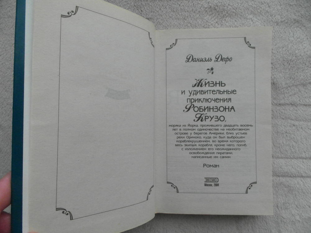 Полное название: Жизнь и удивительные приключения Робинзона Крузо, моряка из Йорка, прожившего двадцать восемь лет в полном одиночестве на необитаемом острове у берегов Америки, близ устьев реки Оринко, куда он был выброшен кораблекрушением, во время которого весь экипаж корабля погиб, с изложением его неожиданного освобождения пиратами, написанные им самим. В 2-х томах (в одном переплете).