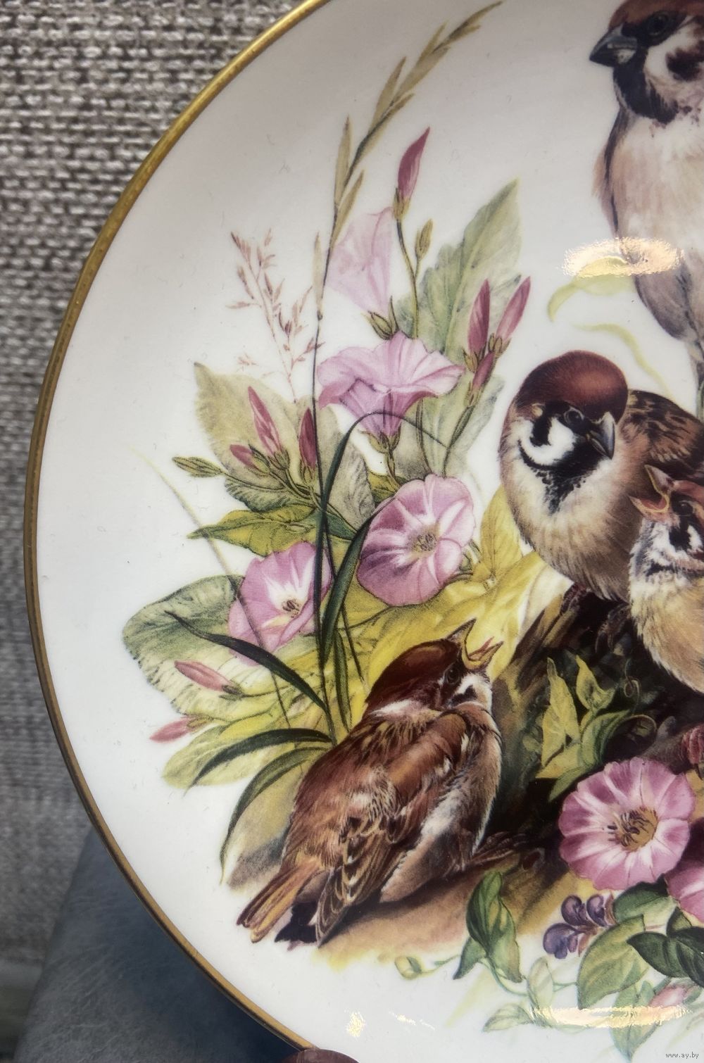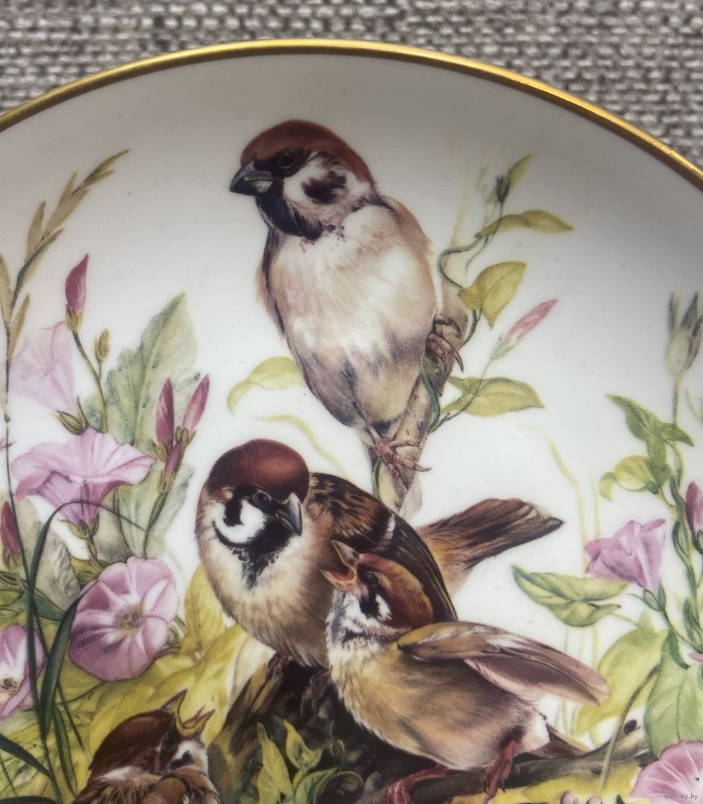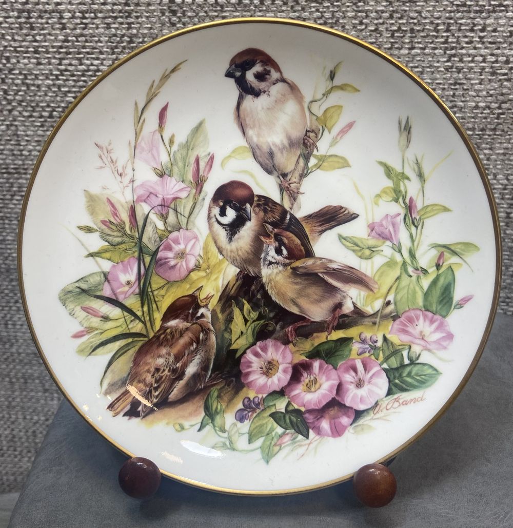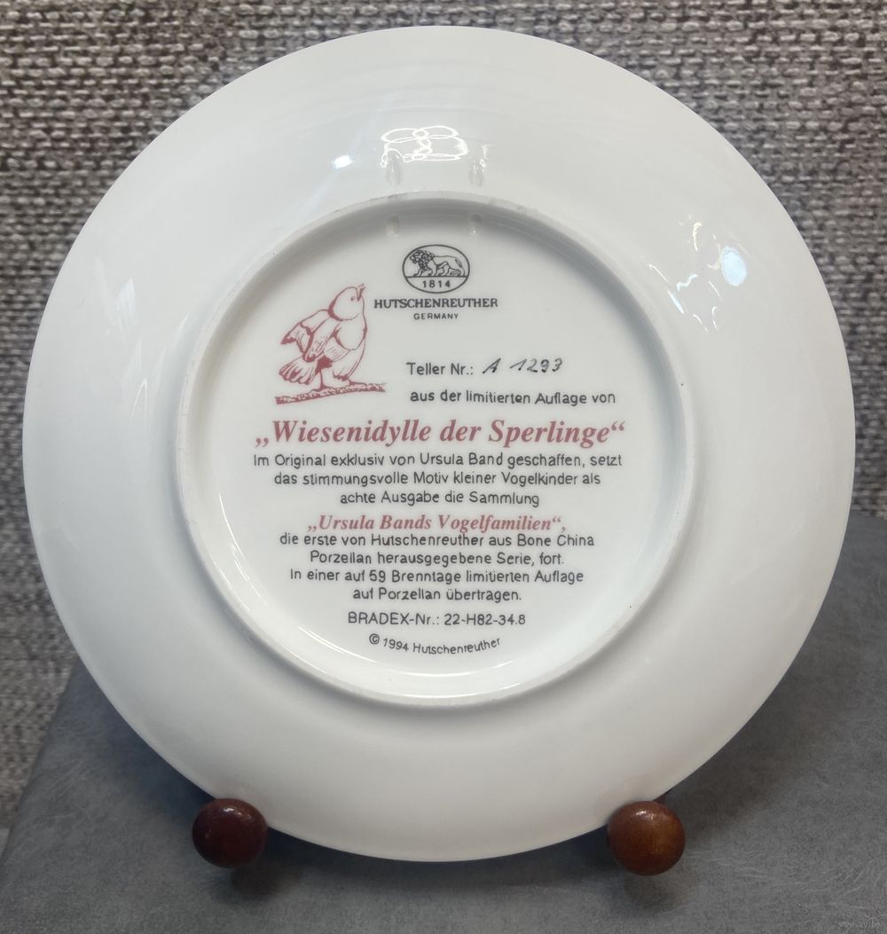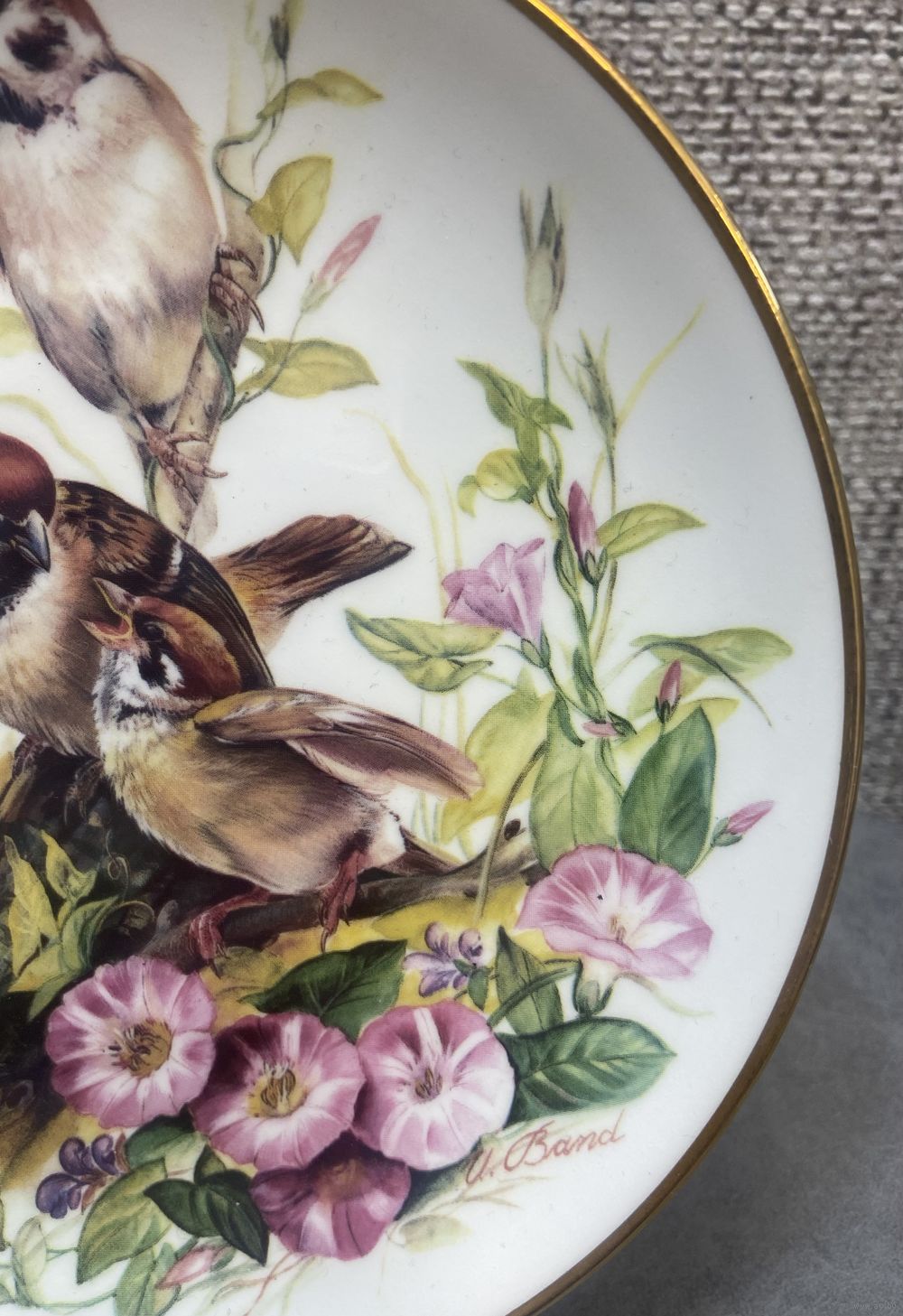 Урсулой Банд для мануфактуры Hutschenreuther. Тарелка имеет золотистую окантовку. В нижней части рисунка видна подпись художника "U. Band".