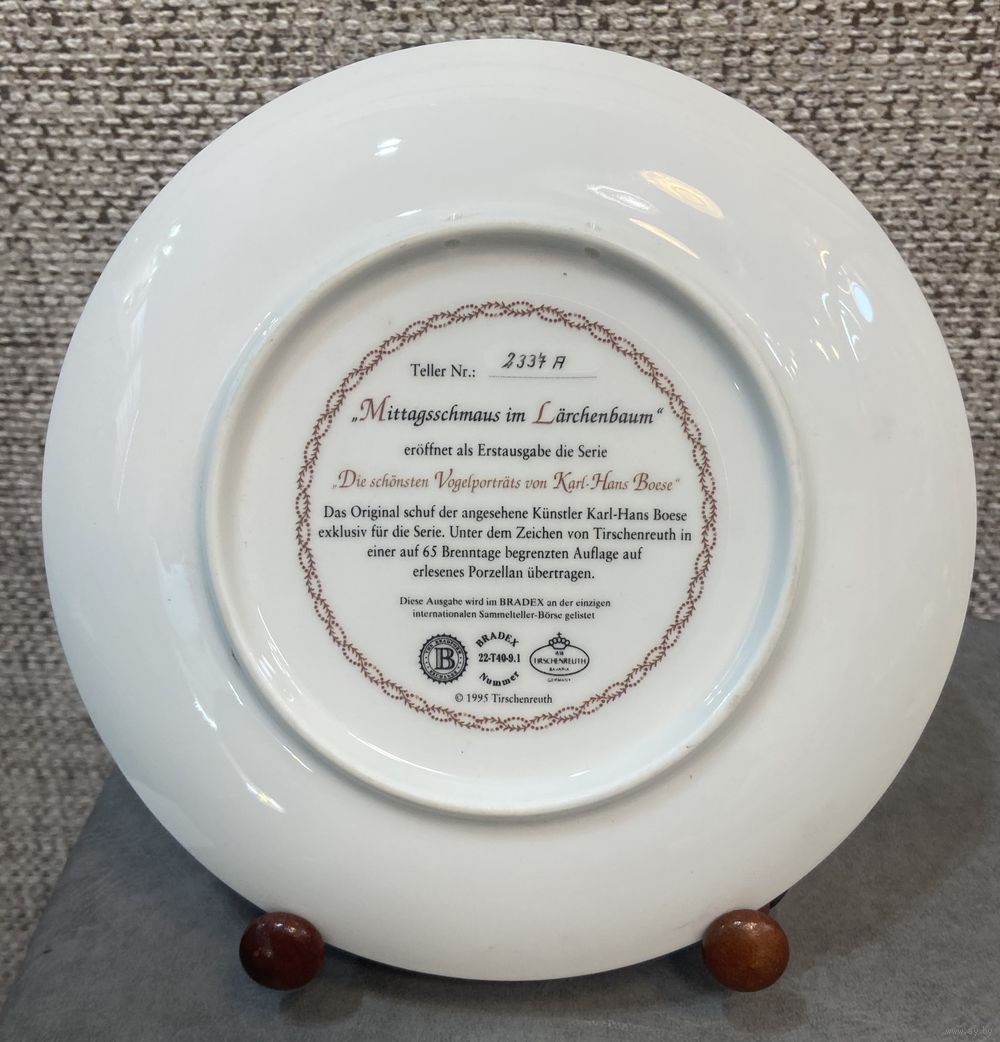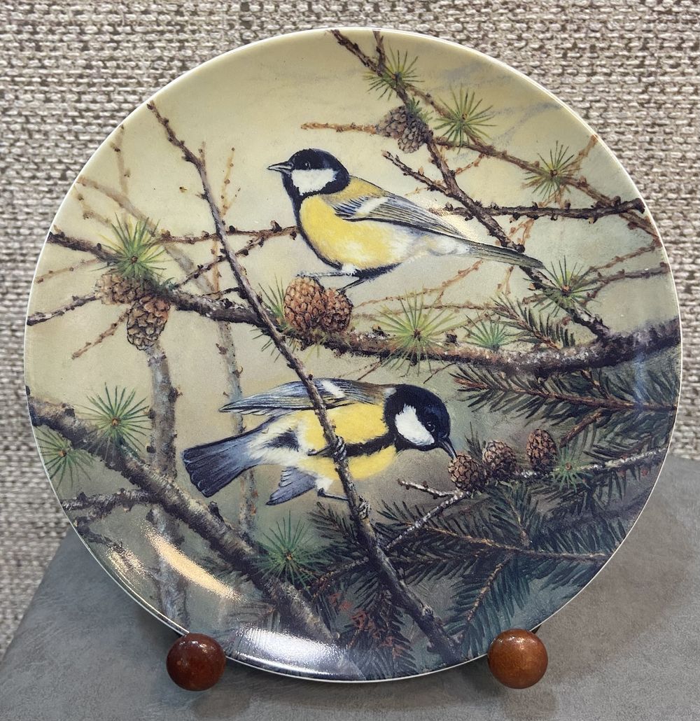 На тарелке две большие синицы, сидящие на ветках хвойного дерева. Ветки украшены шишками и хвоей. Птицы имеют характерную желтую грудку с черной полосой, белые щеки и черные шапочки. Фон рисунка выполнен в светлых, размытых тонах.