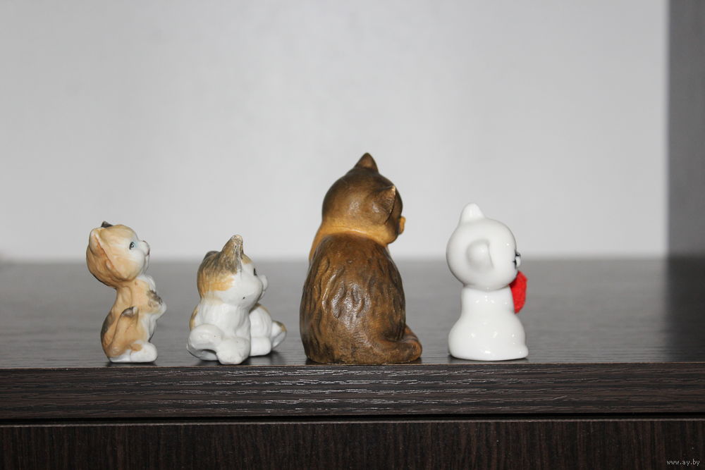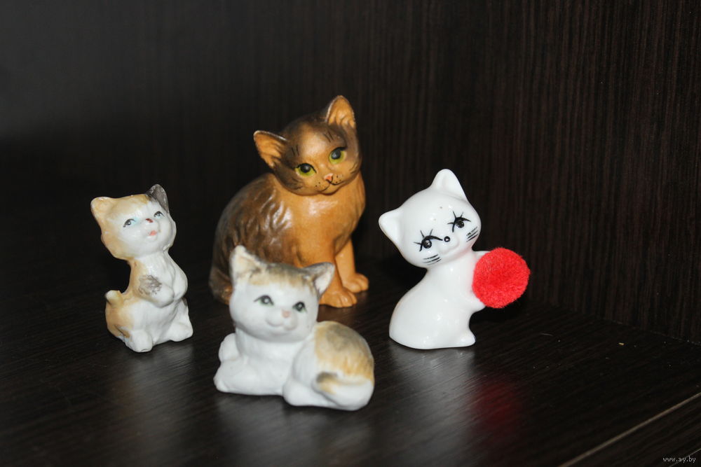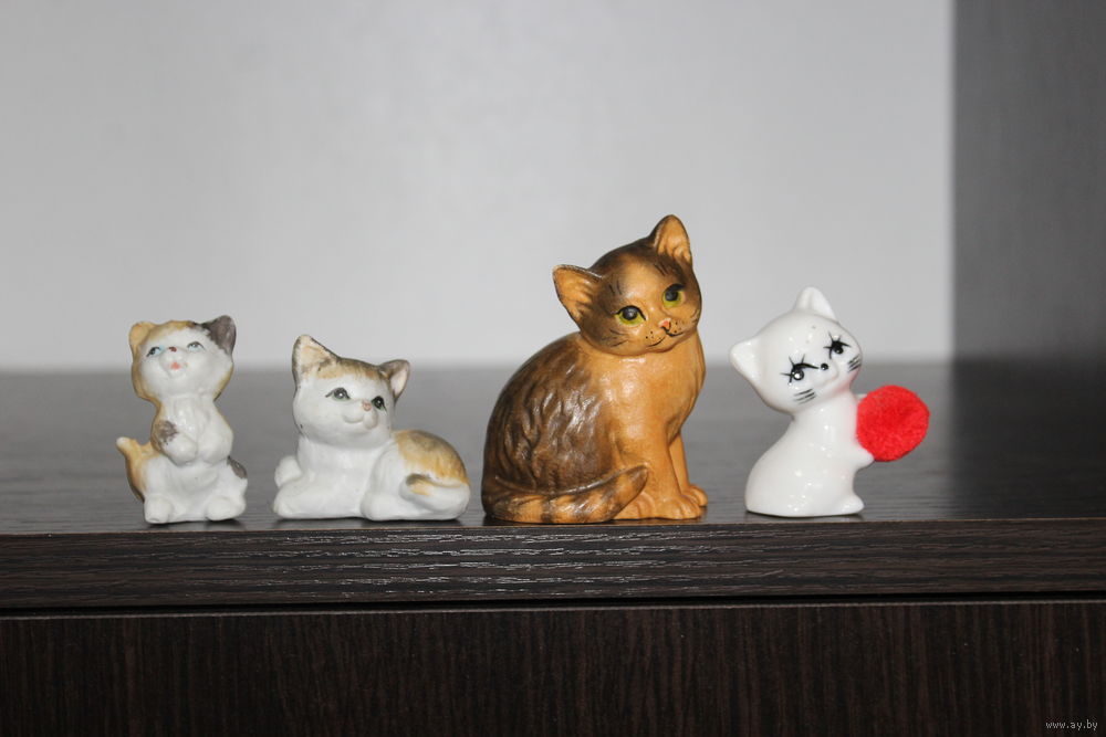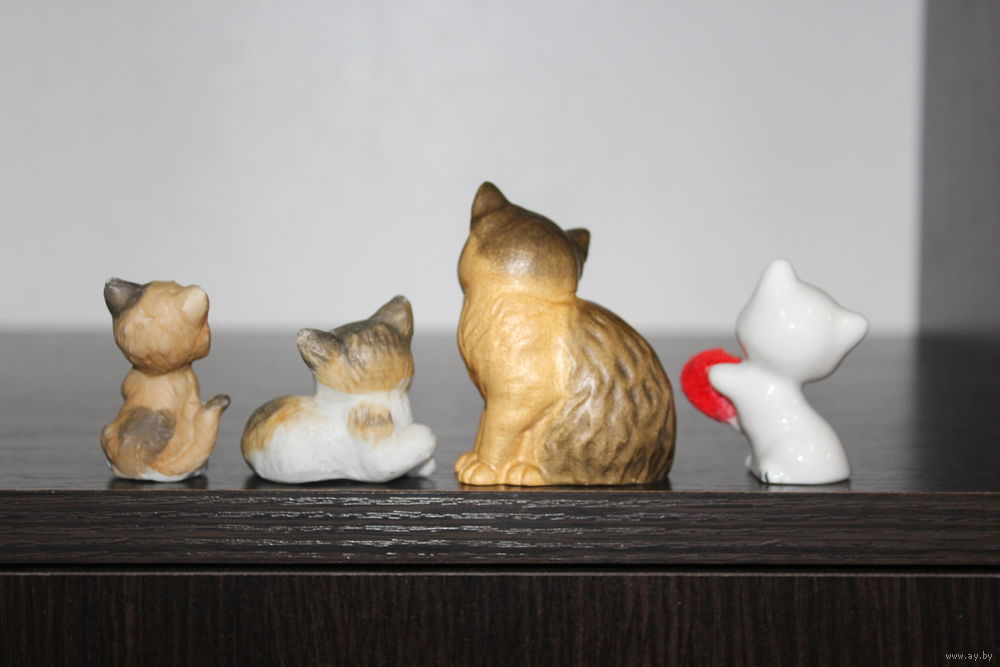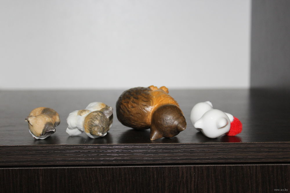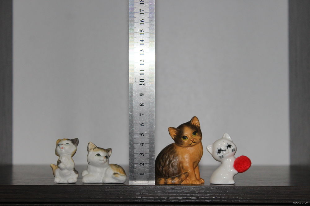 Высота большого котика 6,8 см., ширина 5,2 см., высота сидящего котика 4,5 см., ширина 2,8 см., лежащего котика 4,1 см., ширина 4,6 см., котика с мягким мячом 5 см., ширина 4,4 см.