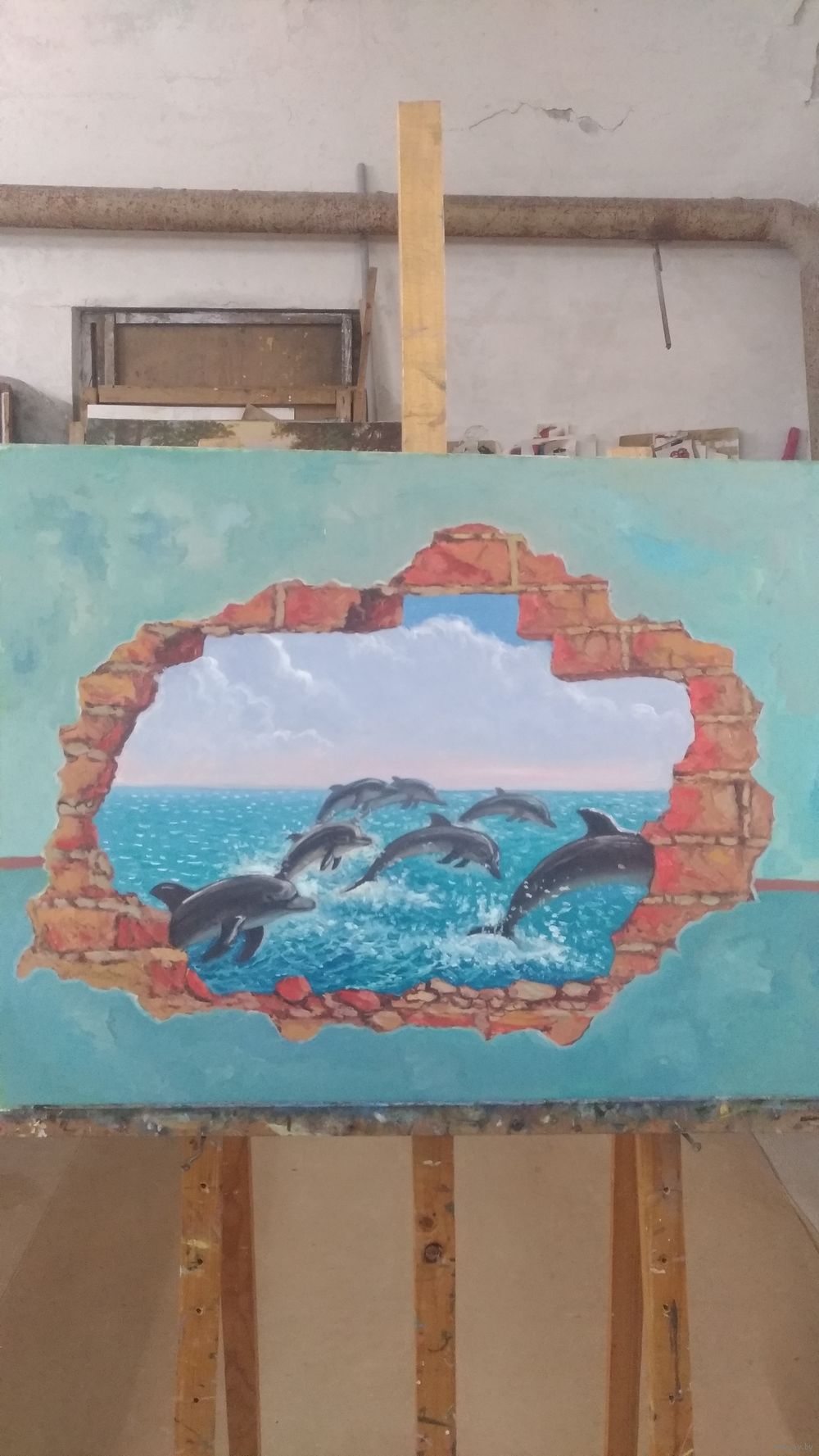 Картина "Дельфины 3D" двп, 2019г, масло, 56х70.