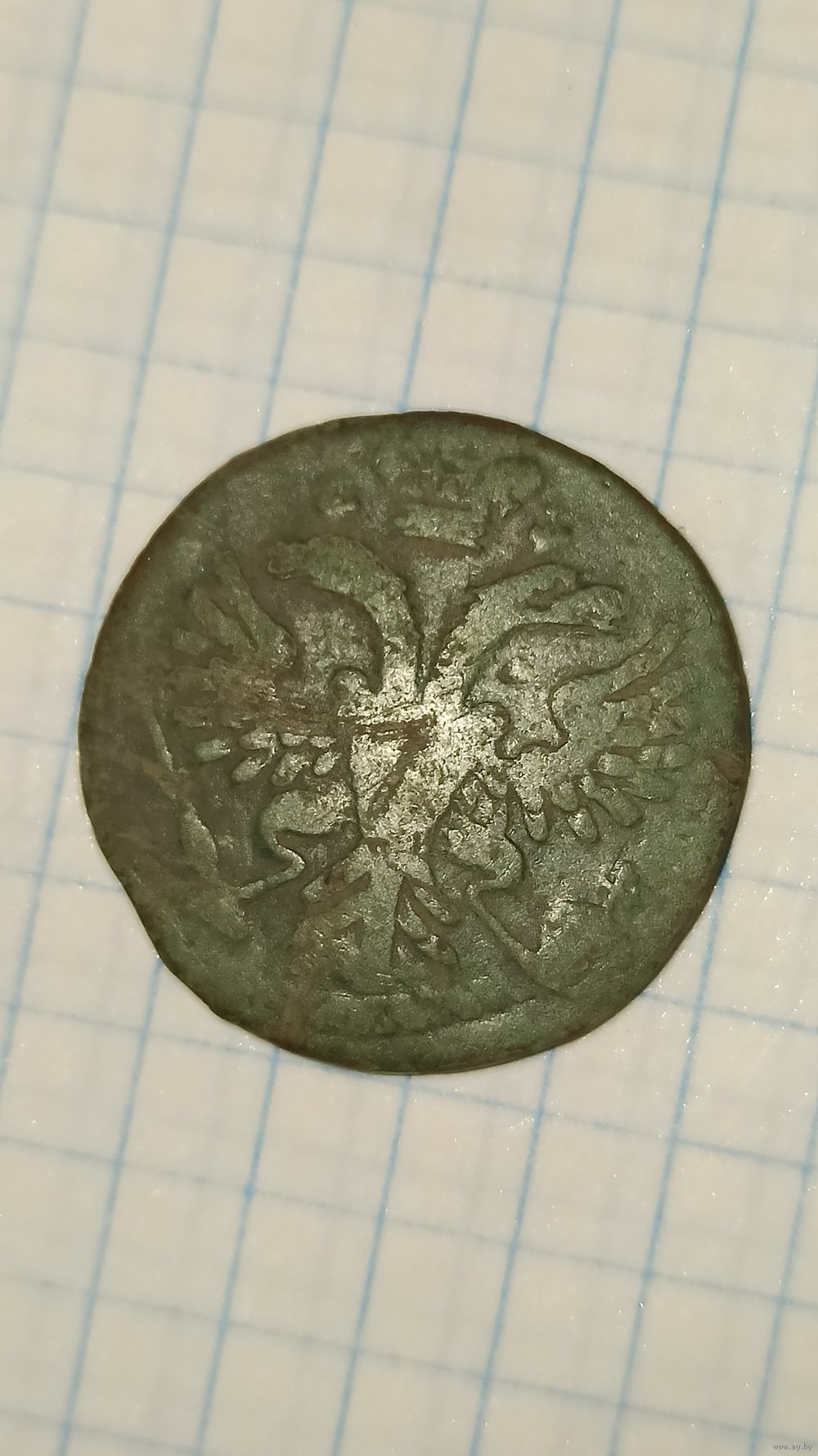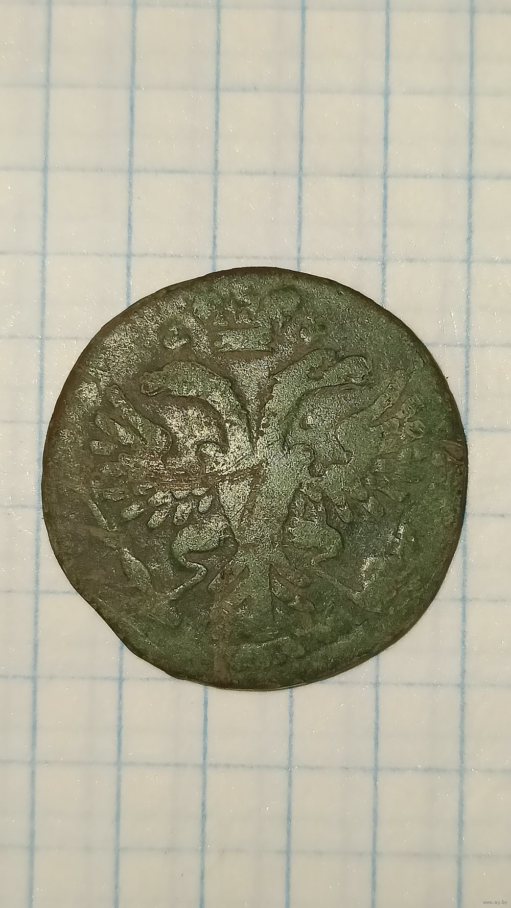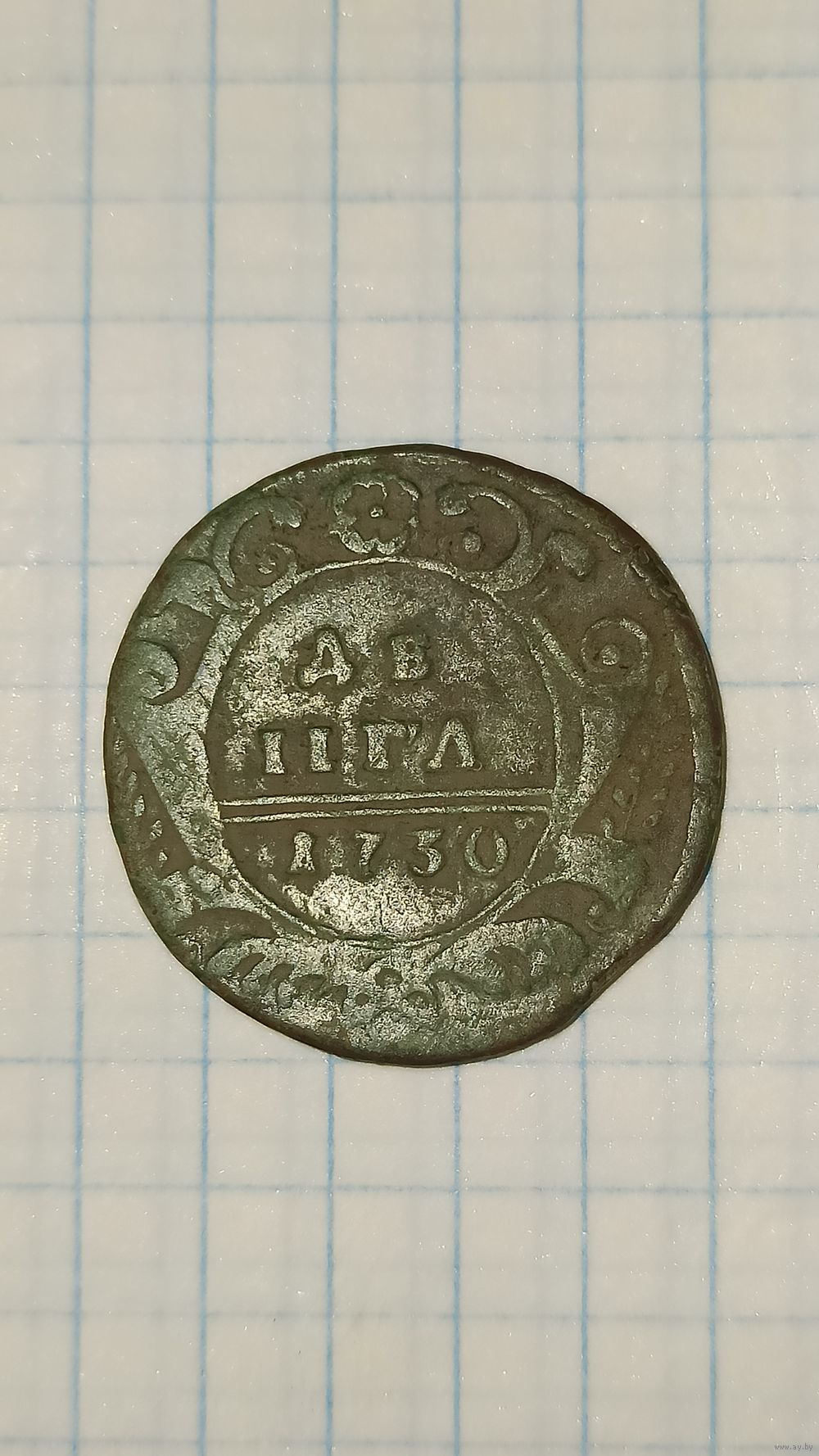 Денга 1730 год. Крест державы "крашенный", гурт сетчатый. Не чистилась. Состояние на фото.