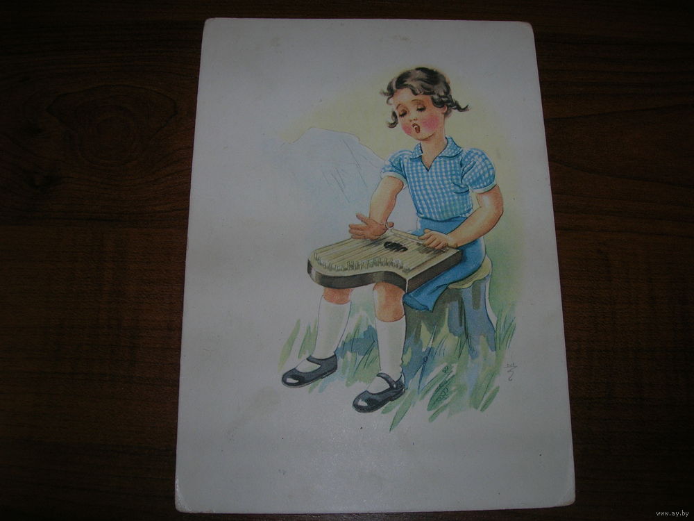Дети Девочка Цитристка Открытка винтажная из серии Кто рано встает, того удача ждет.. Чистая