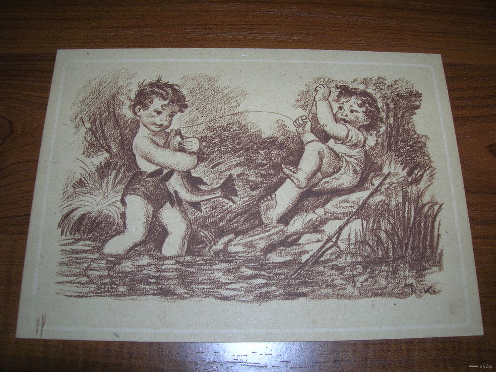 Дети Рыбалка Гравюра Открытка Винтажная Издание НР Чистая