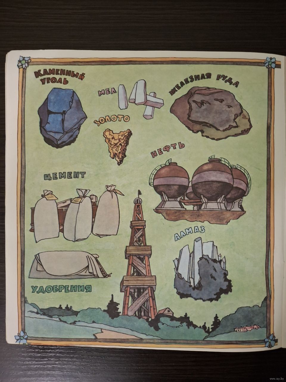 Иллюстрации И. Кабакова. Многочисленные полностраничные и в тексте. Очень интересное и понятное для дошкольников повествование об угле, цементе, черном золоте, слоях земли, геологоразведке, воздушной разведке и многом, многом другом. Формат 260 х 270 мм, целлофанированная обложка.40стр., Состояние очень хорошее , присутствует дарственная надпись .