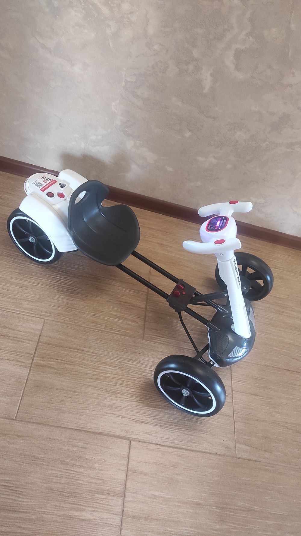 Детский складной электрокартинг, музыкальный, светятся фары, складной. Удобный в переноске, ребенок без проблем может им управлять, передвигать. Безопасный, не делает резких движений, развивает скорость постепенно. Хороший аккумулятор, не подсажена батарея. Подходит для любого типа дорог: трава, гравий плитка, асфальт. Но ребенок катался только дома. Вес до 50 кг. Пользовались меньше года). Часто меняем разные транспортные средства, на каждый день рождения просит новое). находится в Ратомке.