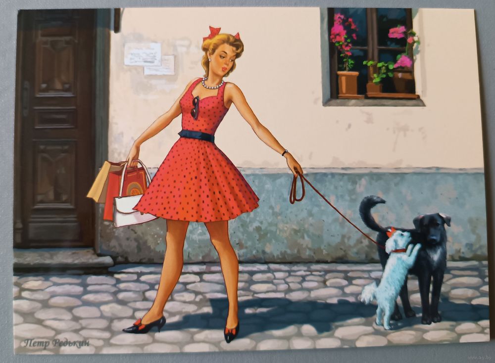 Девушка с собакой. Петр Редькин. Авторская открытка, глянец. АСARDS.BY
