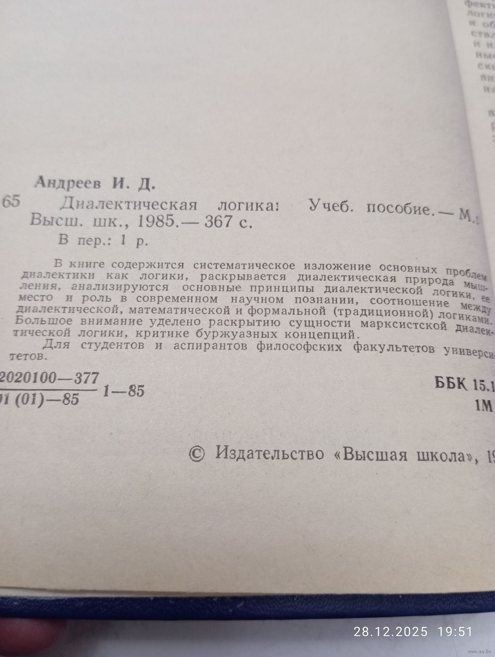 Диалектическая логика. Андреев И. Редкая. М. Высшая школа 1985. В прекрасном состоянии, тв переплет. 367 с. Возможность отправки Белпочтой, полная предоплата на карту Беларусбанк