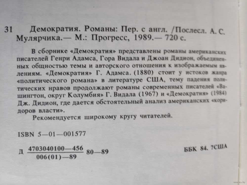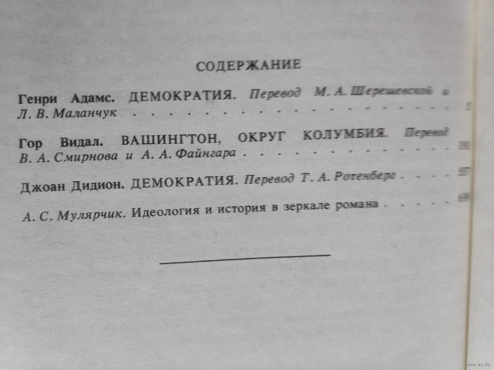 В сборнике «Демократия» представлены романы американских писателей Генри Адамса, Гора Видала и Джоан Дидион, объединенных общностью темы и авторского отношения к изображаемым яз- лениям. «Демократия» Г. Адамса. (1880) стоит у истоков жанра «политического романа» в литературе США, тему падения поля- тических нравов продолжают романы современных писателей «Вашингтон, округ Колумбия» Г. Видала (1967) и «Демократия» (1984) Дж. Дидион, где дается обстоятельный анализ американских «коридоров власти».