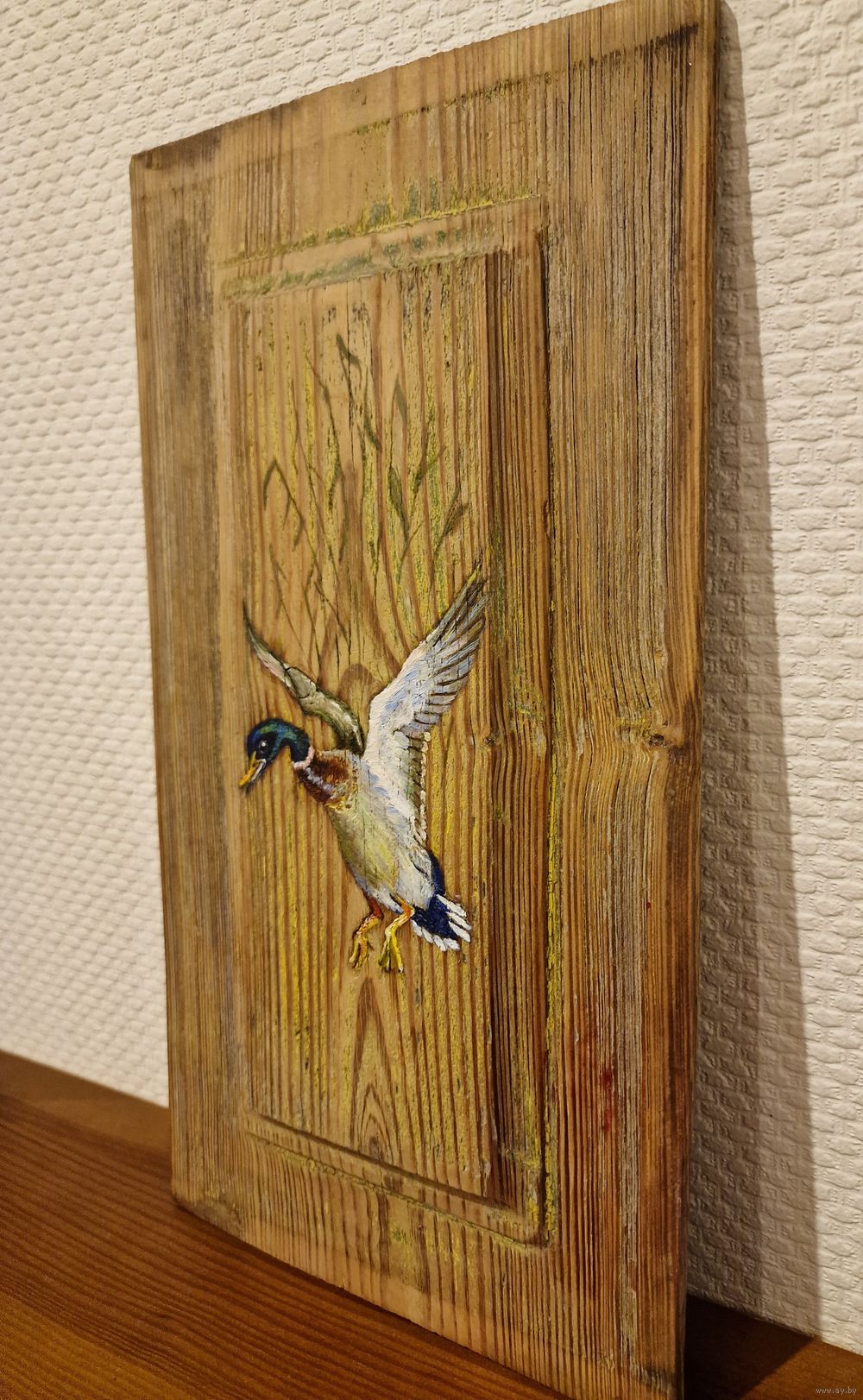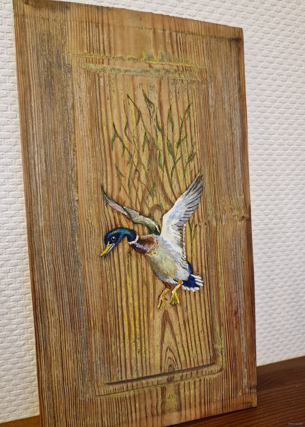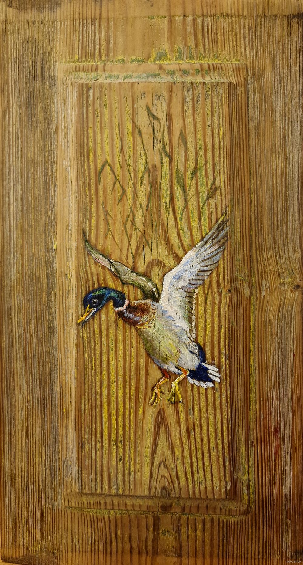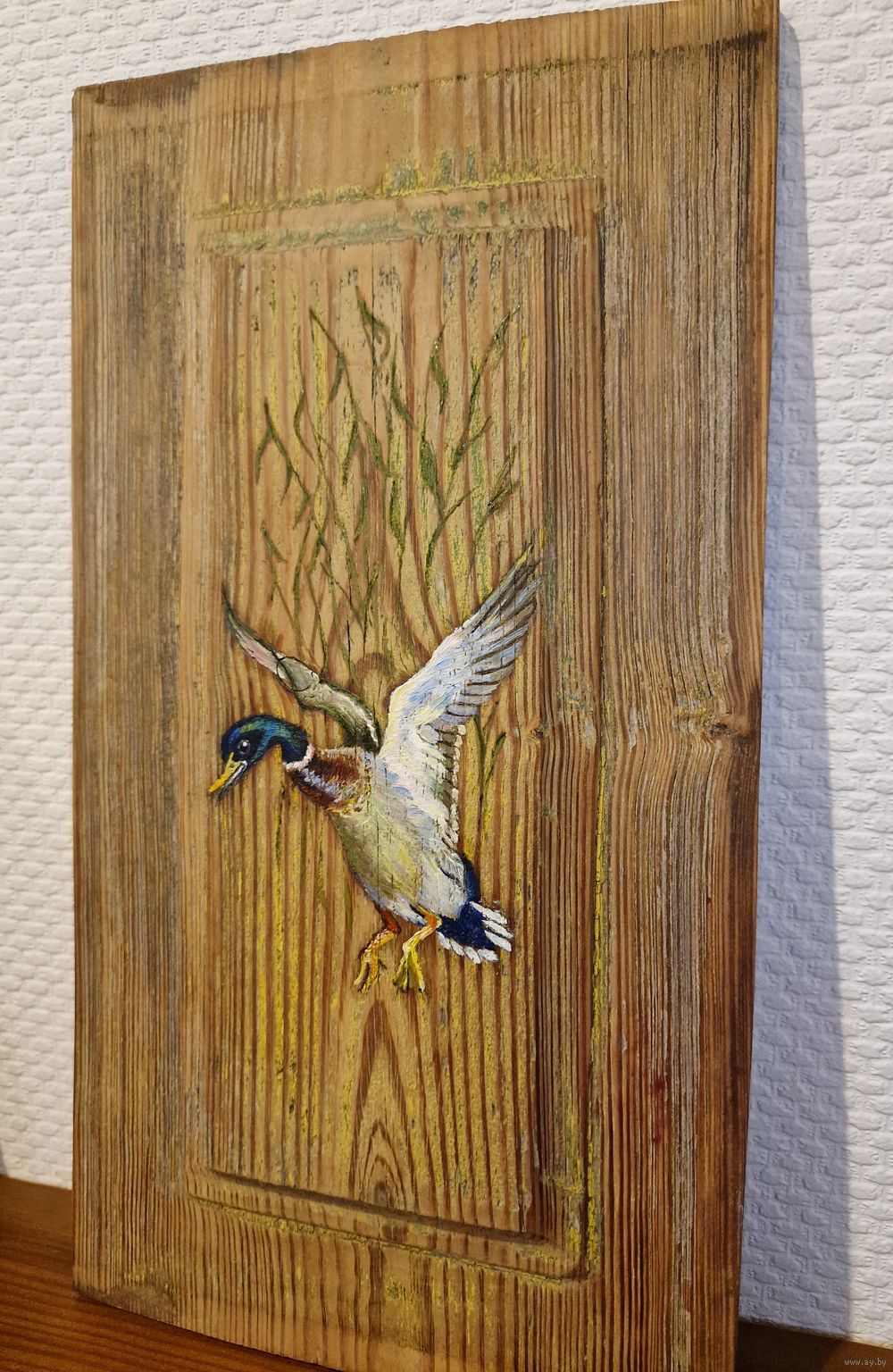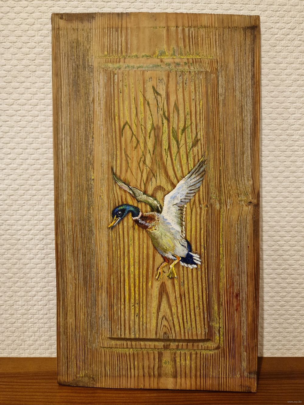 Картина "Дикая утка" , масло на старинной доске хвойных пород дерева.