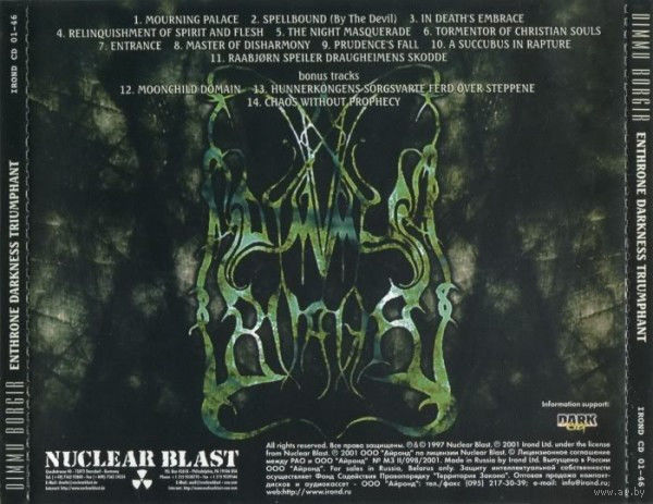 ℗ & © 1997 Nuclear Blast. ℗ 2001 Irond Ltd. under the license from Nuclear Blast. ℗ 2001 ООО "Айронд" по лицензии Nuclear Blast. © Лицензионное соглашение между РАО и ООО "Айронд" № МЗ II/098/2001. Made in Russia by Irond Ltd. Выпущено в России ООО "Айронд". For sales in territory of Russia, Belarus, Ukraine and Baltic States only. Защиту интеллектуальной собственности осуществляет Фонд Содействия Правопорядку "Территория Закона". Оптовая продажа компакт-дисков и аудиокассет – ООО "Айронд".