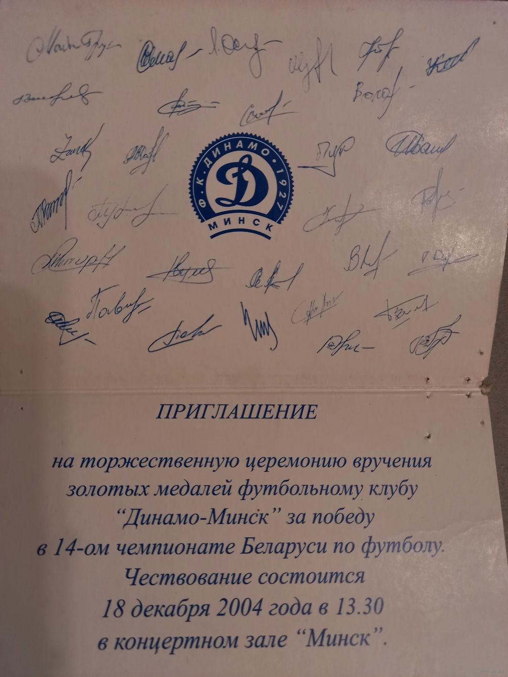 Приглашение Динамо Минск с автографами футболистов 2004 г