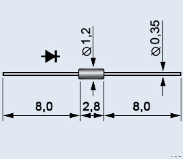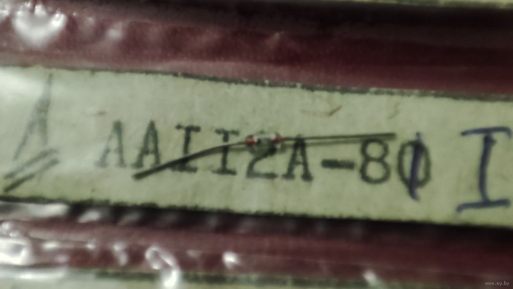• Расшифровка маркировки СВЧ диода: АА112А А - буква, обозначающая исходный материал, из которого изготовлен диод и его категорию качества, где А - арсенид-галлиевый СВЧ диод категории качества «ОТК»; А - буква, указывающая на группу или подкласс диодов, где А - сверхвысокочастотные диоды; 1 - цифра, определяющая основные функциональные возможности СВЧ диодов, где 1 - смесительные диоды; 12 - число, обозначающее порядковый номер разработки; А - буква, определяющая классификацию сверхвысокочастотного диода по параметрам