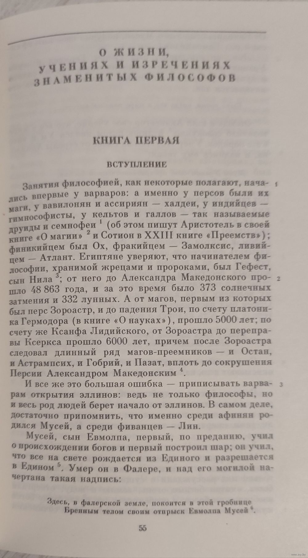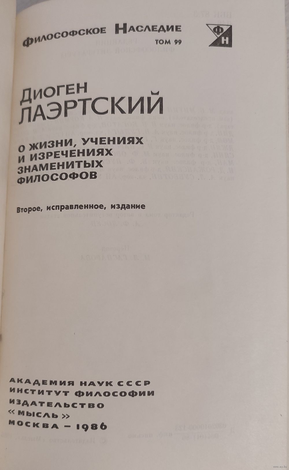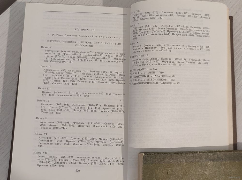 Диоген из Лаэрты в Киликии (первая половина III в. н.э.), грамматик афинский, оставил нам сочинения, являющиеся единственной "историей философии", написанной в античности. Они состоят из 10 книг, в которых излагаются учения древнегреческих мыслителей, начиная с семи мудрецов и кончая стоической и эпикурейской школами. Кроме сочинений Диогена в настоящее издание входят биографии Платона, Пифагора, Плотина и Прокла, написанные другими авторами – Порфирием, Олимпиодором, Марином.