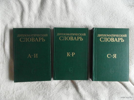 Цена за весь комплект. Дипломатический словарь содержит статьи о внешней политике СССР и России, истории международных отношений и дипломатии, по дипломатической практике и дипломатическому протоколу, международному праву и многое др. Содержание. Том 1: А-И. Том 2: К-Р. Том 3: С-Я. Приложения: Совместное Советско-Американское заявление 21.11.1985 г. Общее соглашение между СССР и США 1985 г. Действующие советские дипломаты, имеющие ранг чрезвычайного и полномочного посланника на 1.12.1985 г. Министры иностранных дел государств, с которыми СССР имеет дипотношения на 10.02.1986 г. Главы дип. представительств иностранных государств в СССР на 10.02.1986 г. Тематический указатель. Персоналии, включенные в словарь. Авторы.