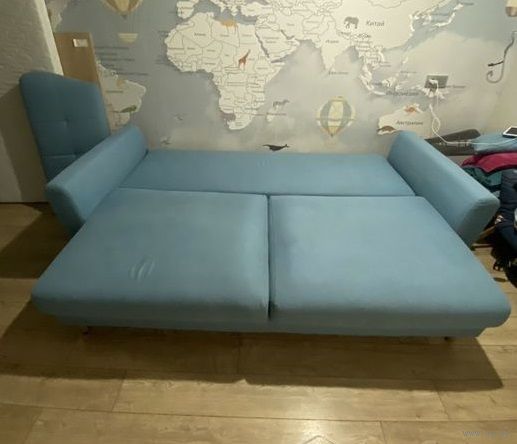 Стильный и современный диван в отличном состоянии, длина с подлокотниками 2,35м, спальное место 2*1,5м, в сложенном виде 1м, в разложенном состоянии немного скрипит, нужно хорошо зажать при сборке. Имеется вместительная ниша для белья. Подушки со съемным чехлом, есть еще 2 маленькие подушки в комплекте. Самовывоз из Минск Мира.