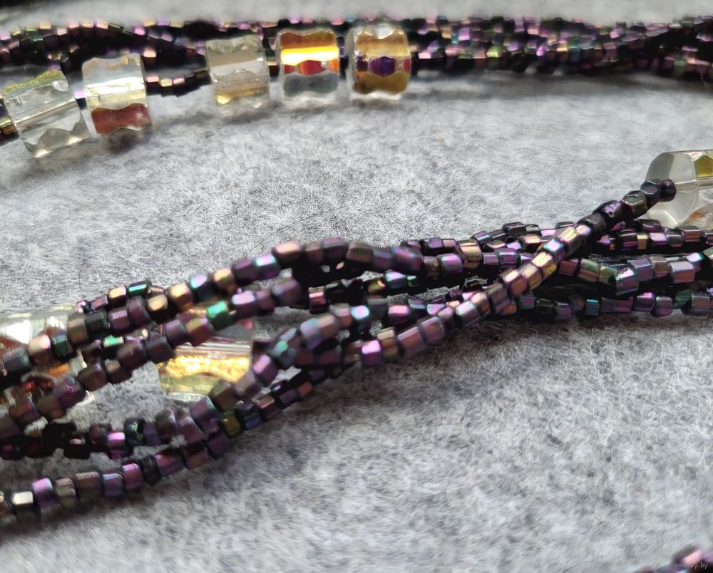 Длинные бусы (87 см), 5 нитей - фиолетовый бисер с радужным отливом и 1 нить бисер + большие (7-8 мм) бусины из радужного стекла. Оригинальная застежка в виде цветка.