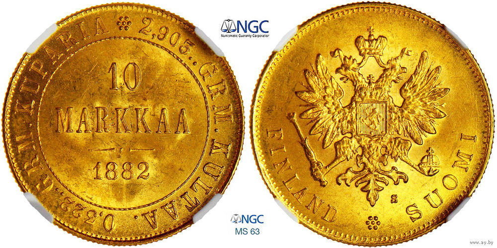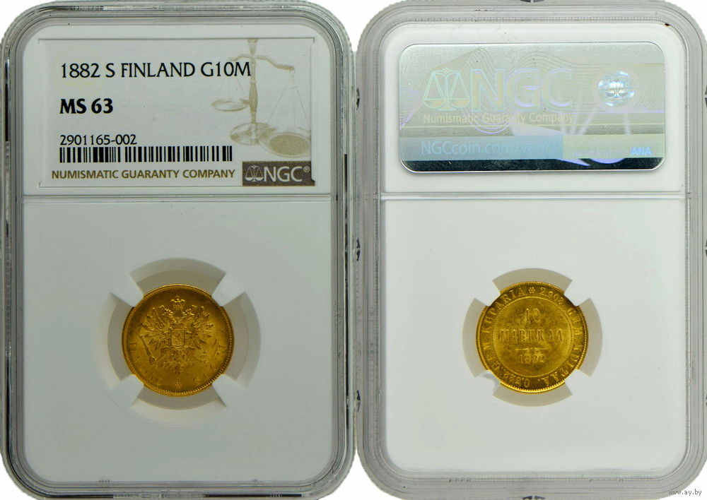 Александр III для Финляндии. 10 марок 1882 г. S. Золото. Отличное коллекционное состояние. Монета в слабе NGC, сохранность MS 63. Уздеников# 4727 (черта). Биткин# 229. Holmasto99# 824. Казаков# 580.