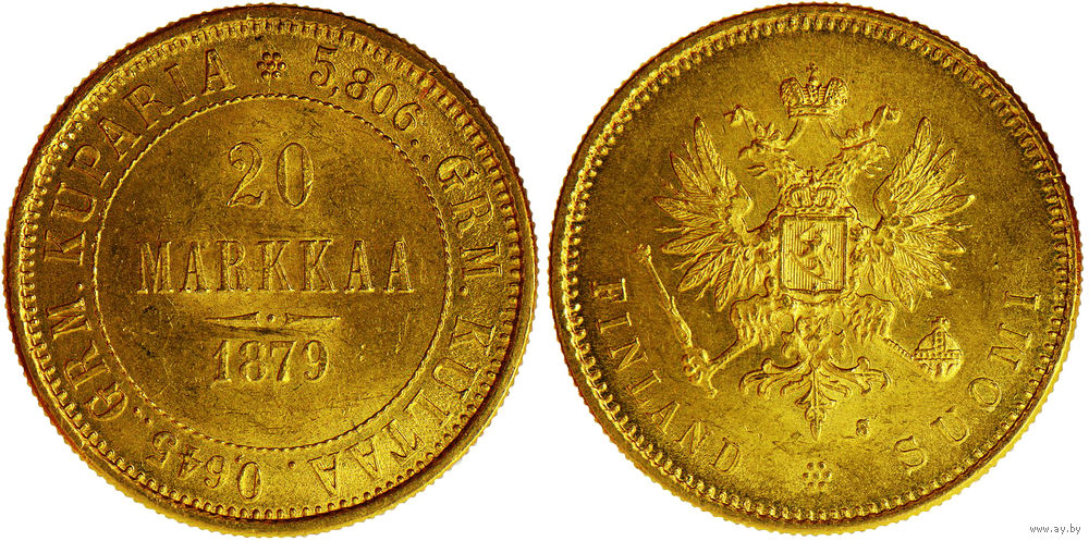Для Финляндии, 20 марок 1879 года, S. Золото. Сохранность отличная, штемпельный блеск. Уздеников# 4722 (черта). Биткин# 612. Holmasto99# 832.