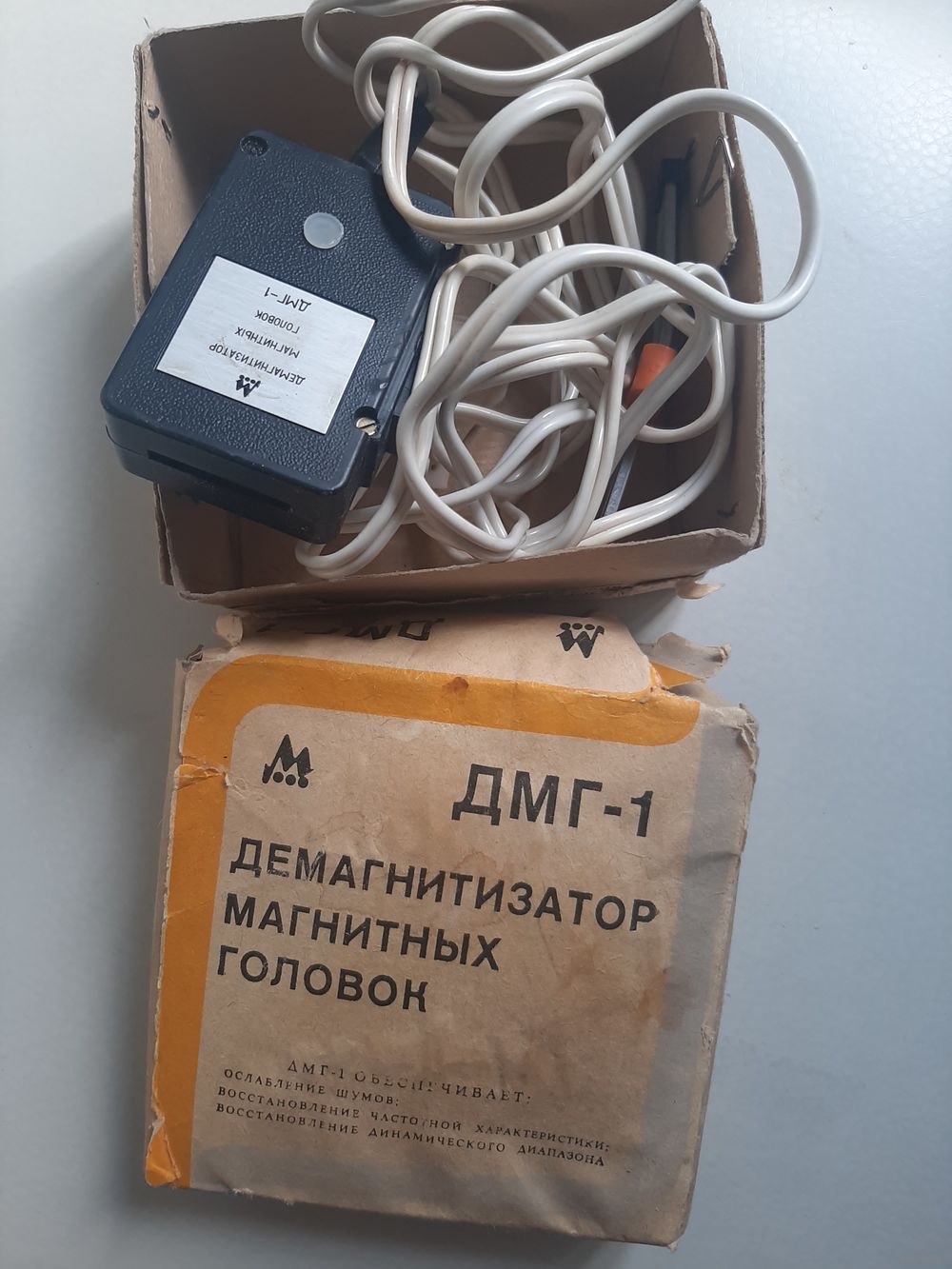 Демагнитизатор магнитных головок "ДМГ-1" выпускал с 1984 года Минский завод ЭВМ, р. Беларусь. Предназначен для размагничивания магнитных головок кассетных и катушечных магнитофонов, магнитол и плееров, после чего восстанавливается частотный диапазон, уменьшаются шумы и восстанавливается динамический диапазон.