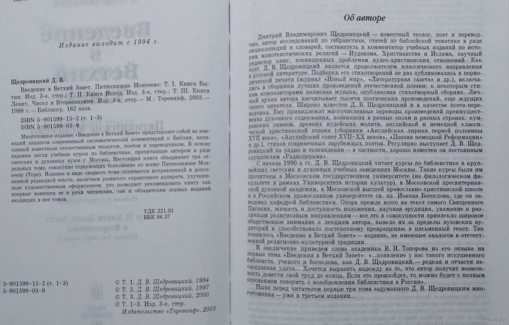 Большой формат. Тираж 5000 экз. 1088 стр. В состав сборника вошли три выпуска серии "Введение в Ветхий Завет" -уникального по охвату материала современного систематического комментария к Библии, создаваемого известным отечественным теологом, поэтом и переводчиком. В основу комментария легли учебные курсы по библеистике, прочитанные автором в ряде светских и духовных вузов г. Москвы. Настоящая книга содержит полное толкование ко всему Пятикнижию Моисееву (Торе). Издание снабжено развитым справочным аппаратом и представительным списком литературы по библеистике. Книга предназначена как для самостоятельного чтения, так и для использования в учебном процессе вузов.
