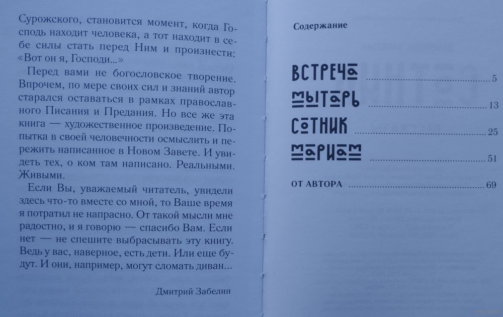 Большой формат. Тираж 5000 экз. Книгу Дмитрия Забелина «Сотник» составляют четыре рассказа, посвященные евангельским персонажам: «Встреча» (праведный Симеон Богоприимец), «Мытарь» (мытарь Закхей), «Сотник» (мученик Лонгин сотник), «Мариам» (равноапостольная Мария Магдалина). «Перед вами не богословское творение. Впрочем, по мере своих сил и знаний автор старался оставаться в рамках православного Писания и Предания. Но все же эта книга — художественное произведение. Попытка в своей человечности осмыслить и пережить написанное в Новом Завете. И увидеть тех, о ком там написано. Реальными. Живыми», – пишет Дмитрий Забелин.