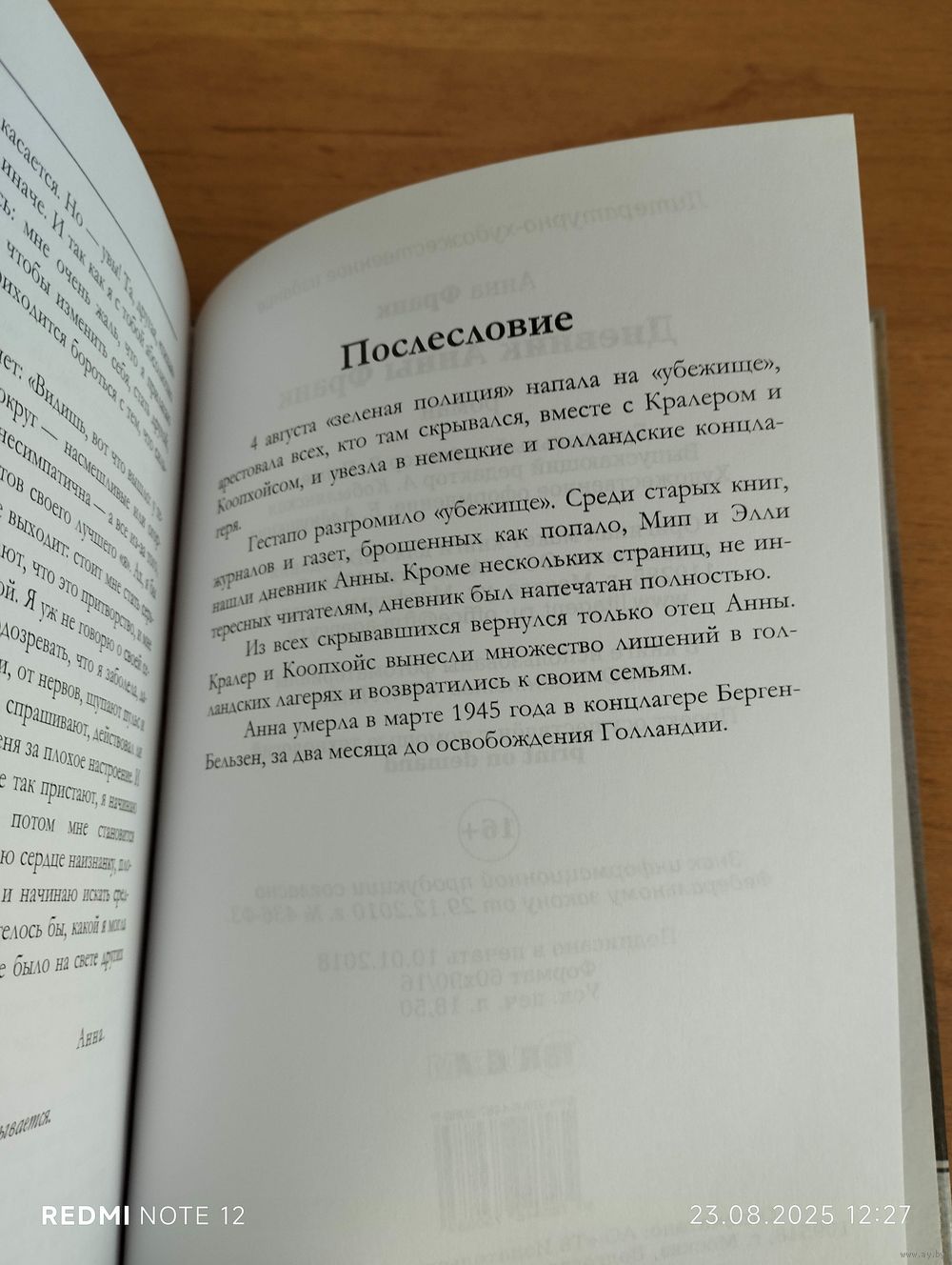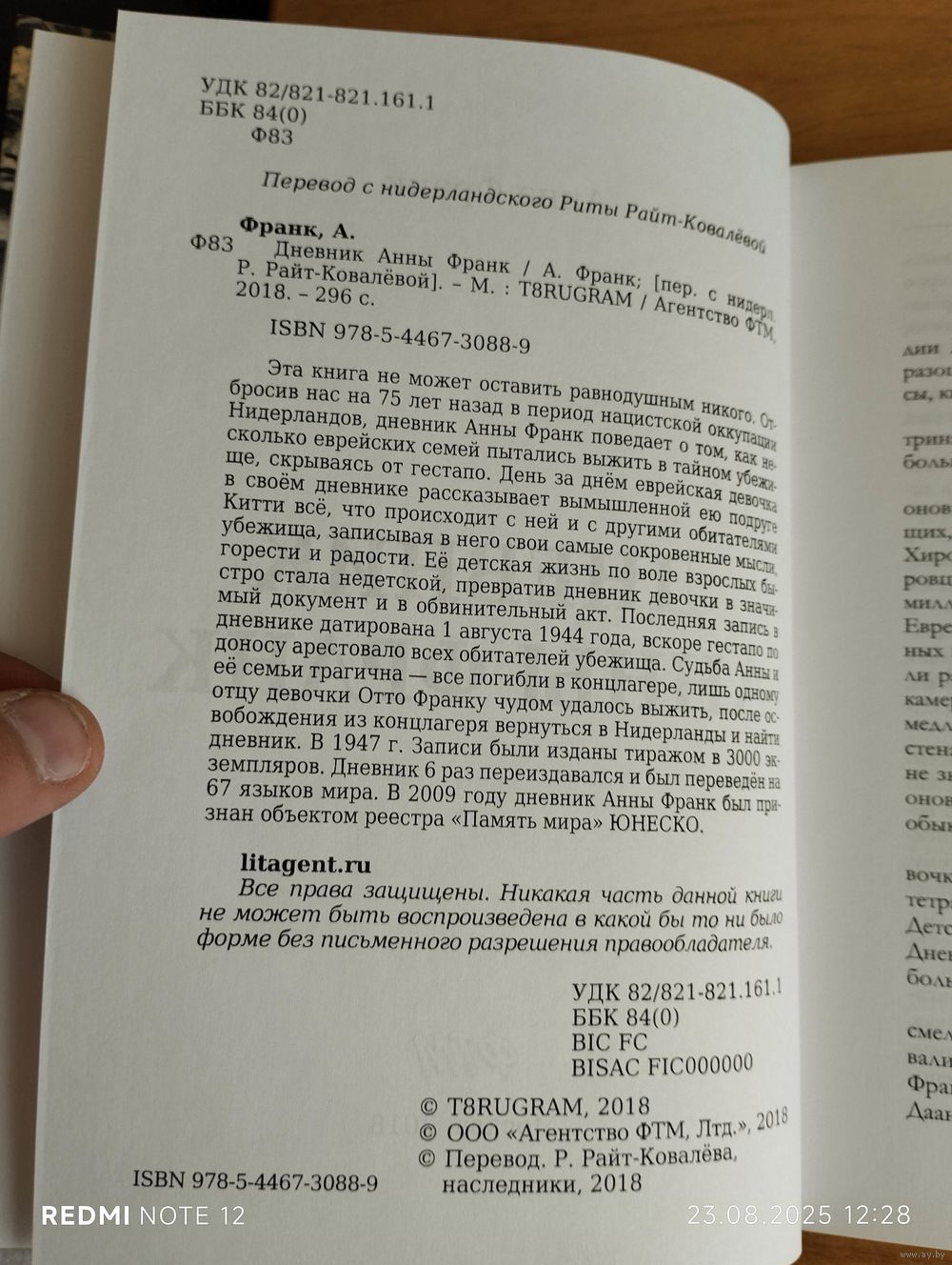 Эта книга не может оставить равнодушным никого. Отбросив нас на 75 лет назад в период нацистской оккупации Нидерландов, дневник Анны Франк поведает о том, как несколько еврейских семей пытались выжить в тайном убежище, скрываясь от гестапо. День за днём еврейская девочка в своём дневнике рассказывает вымышленной ею подруге Китти всё, что происходит с ней и с другими обитателями убежища, записывая в него свои самые сокровенные мысли, горести и радости. Её детская жизнь по воле взрослых быстро стала недетской, превратив дневник девочки в значимый документ и в обвинительный акт. Последняя запись в дневнике датирована 1 августа 1944 года, вскоре гестапо по доносу арестовало всех обитателей убежища. Судьба Анны и её семьи трагична - все погибли в концлагере, лишь одному отцу девочки Отто Франку чудом удалось выжить, после освобождения из концлагеря вернуться в Нидерланды и найти дневник. В 1947 г. Записи были изданы тиражом в 3000 экземпляров. Дневник 6 раз переиздавался и был переведён на 67 языков мира. В 2009 году дневник Анны Франк был признан объектом реестра "Память мира" ЮНЕСКО.