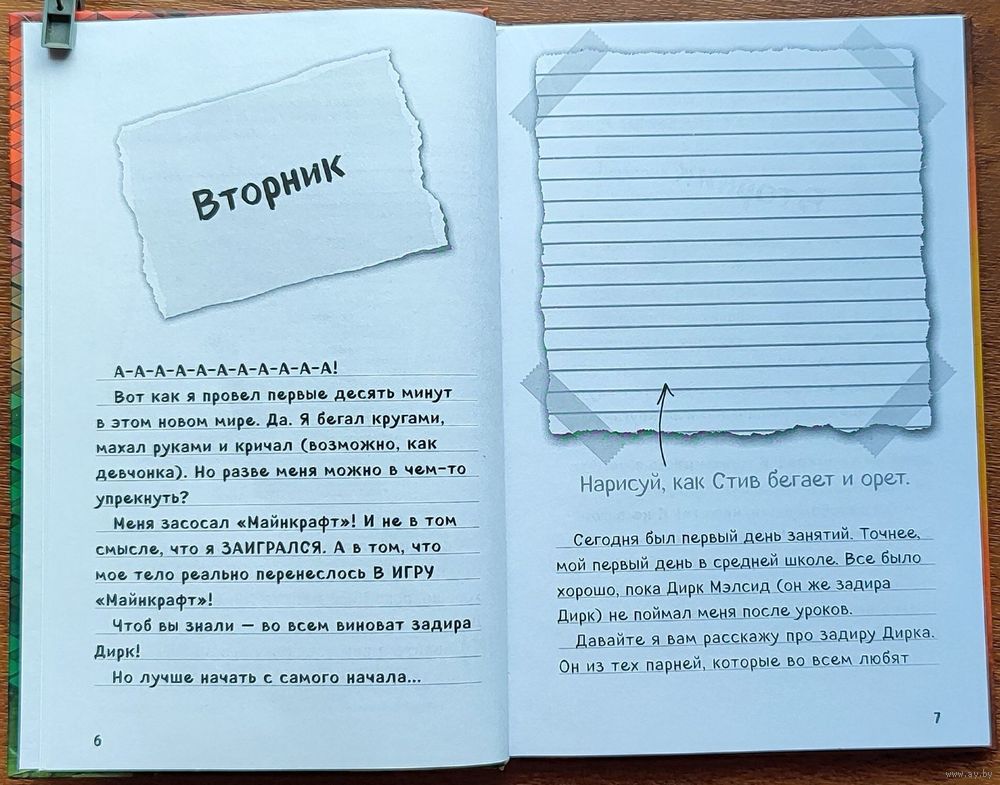 Поскольку эта книга является дневником, в ней можно творить. Внутри есть пространство для креатива, где читатель может нарисовать героев книги или составить собственный план по защите деревни от зомби.
