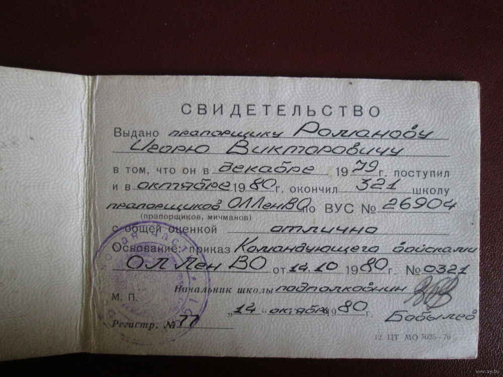 Документ.МО СССР .Свидетельство об окончании школы прапорщиков