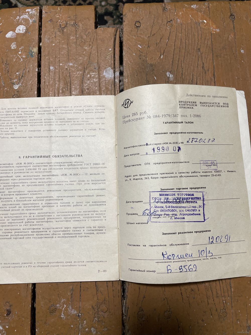 Документ на магнитофон ИЖ М-303С СССР 1990