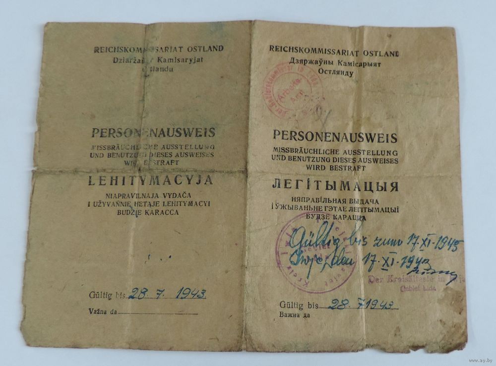 Документ "PERSONENAUSWEIS. ЛЕГIТЫМАЦЫЯ 1943 г. город ЛИДА. (2- мировая война).