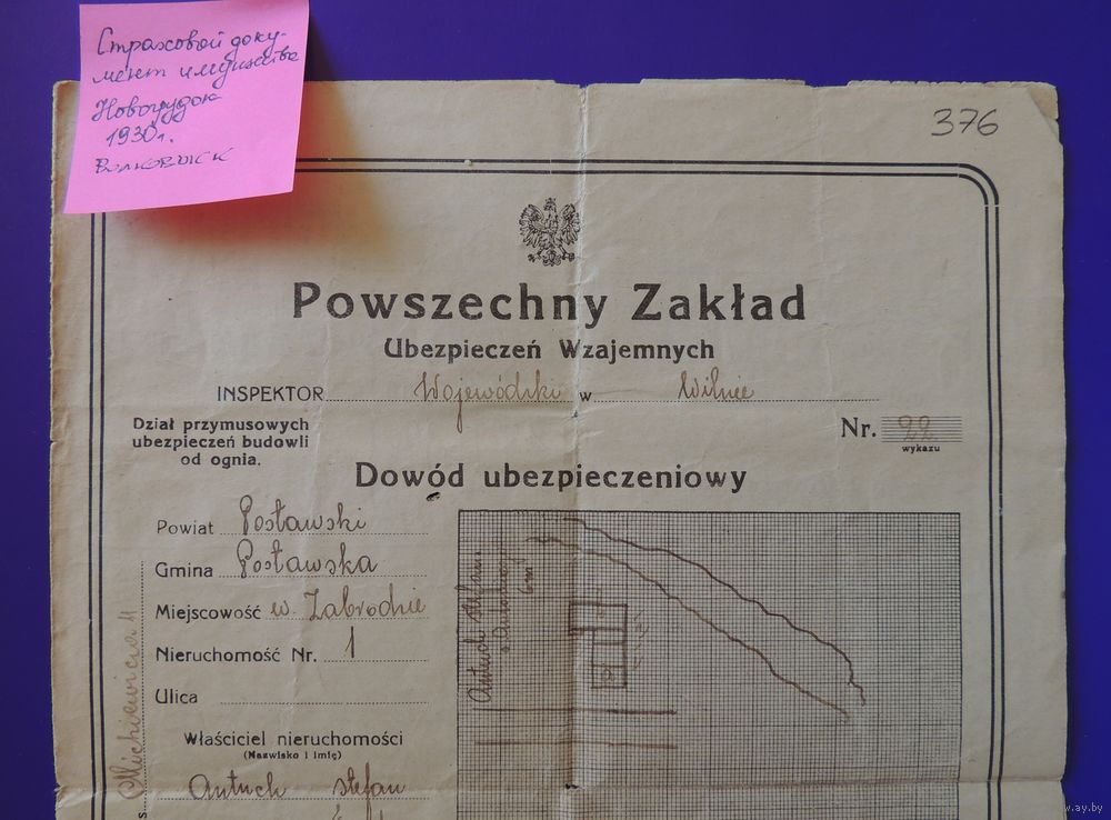Документ старая Польша "Страховой полис имущества", 1930 г., Волковыск