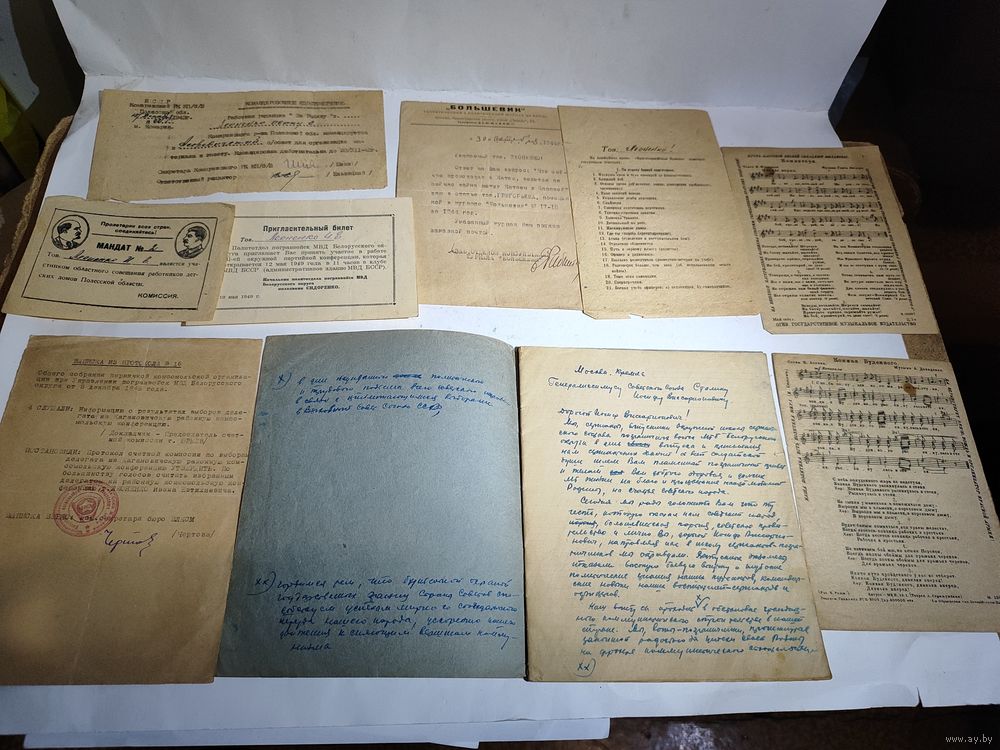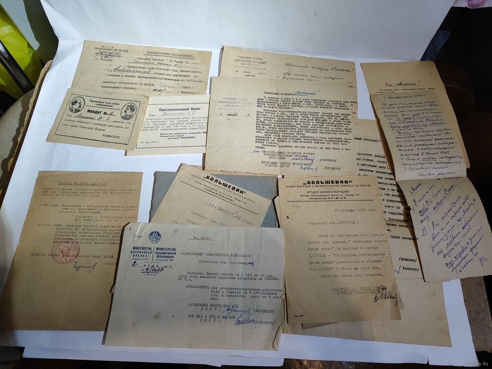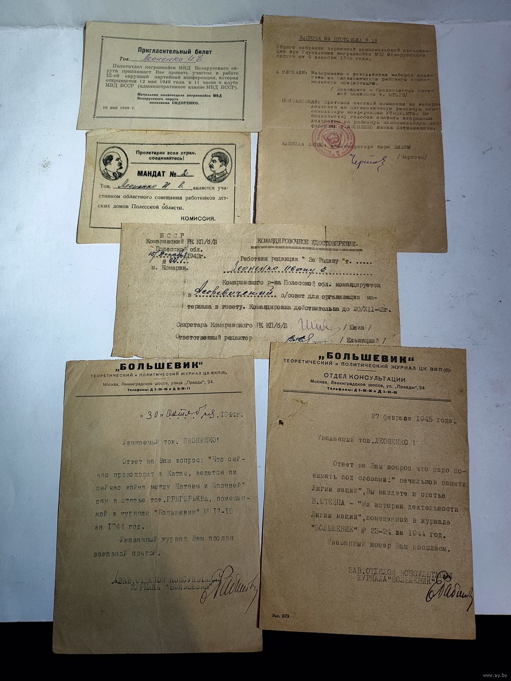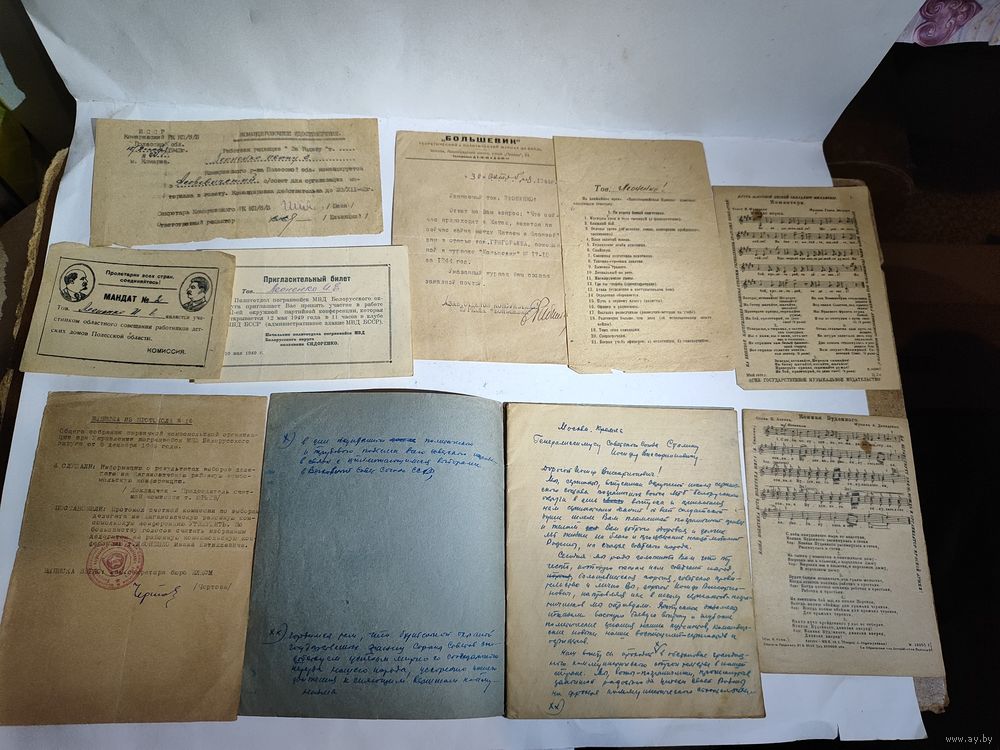 1...Командировочное удостоверение газеты "За Родину"1943г. 2... Четыре письма корреспонденту газеты"Красноармейская правда"-1946г. 3...Записка "Коллективная читка" с правками гл. редактора.4.. Два ответа из журнала "Большевик"(1945 г.). 5..Тематический план. 6..2 мандата 1949г.. 7...Выписка из протокола общего собрания ВЛКСМ 1948г. 8...справка 1951г. 9... Две агитки с Советскими песнями "Конная Будённого","Коминтерн",Железными резервами,"О наркоме"-1931г. 10...Тетрадь- Черновик с письмом И.В.Сталину.и другими письмами родственникам ... Состояние на фото.
