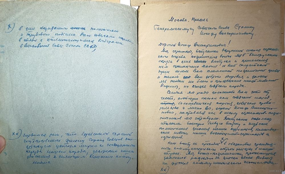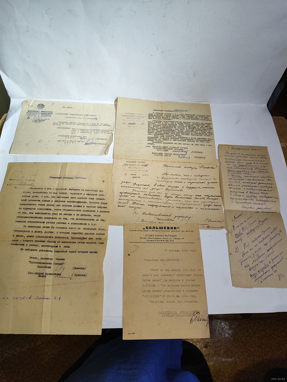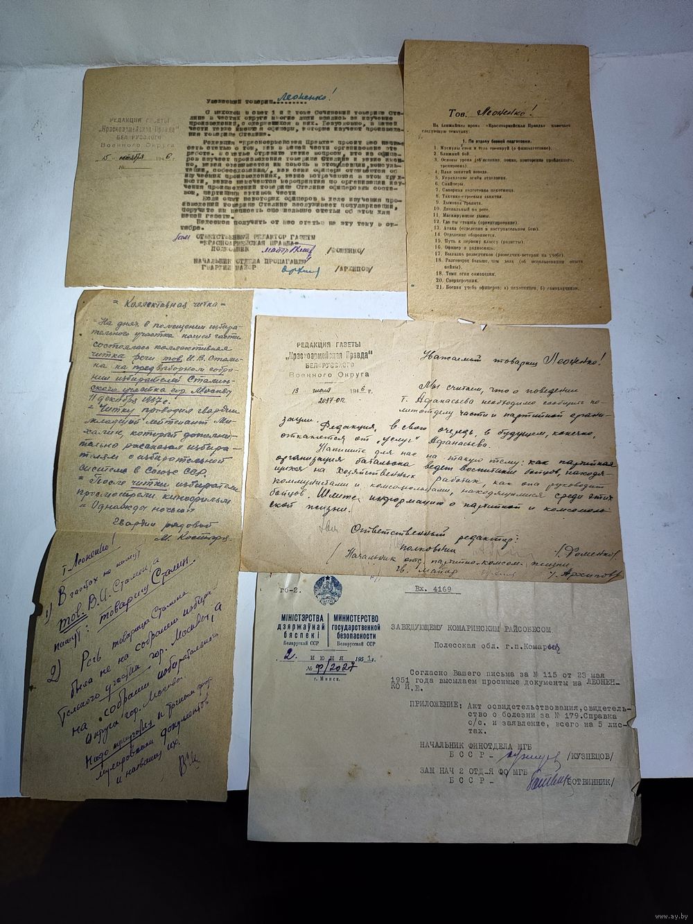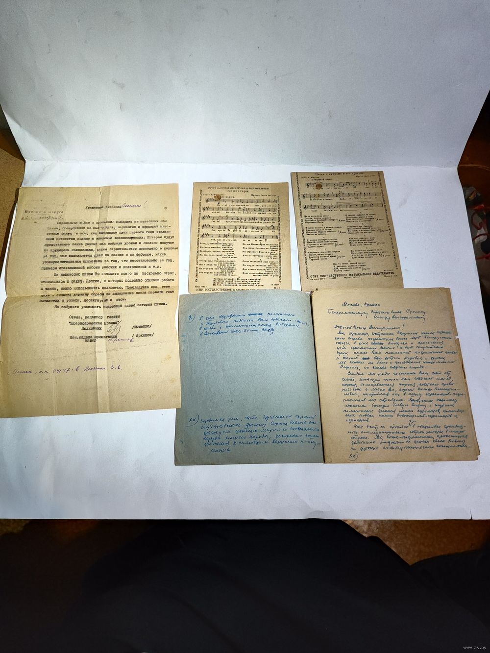 1...Командировочное удостоверение газеты "За Родину"1943г. 2... Четыре письма корреспонденту газеты"Красноармейская правда"-1946г. 3...Записка "Коллективная читка" с правками гл. редактора.4.. Два ответа из журнала "Большевик"(1945 г.). 5..Тематический план. 6..2 мандата 1949г.. 7...Выписка из протокола общего собрания ВЛКСМ 1948г. 8...справка 1951г. 9... Две агитки с Советскими песнями "Конная Будённого","Коминтерн",Железными резервами,"О наркоме"-1931г. 10...Тетрадь- Черновик с письмом И.В.Сталину.и другими письмами родственникам ... Состояние на фото.