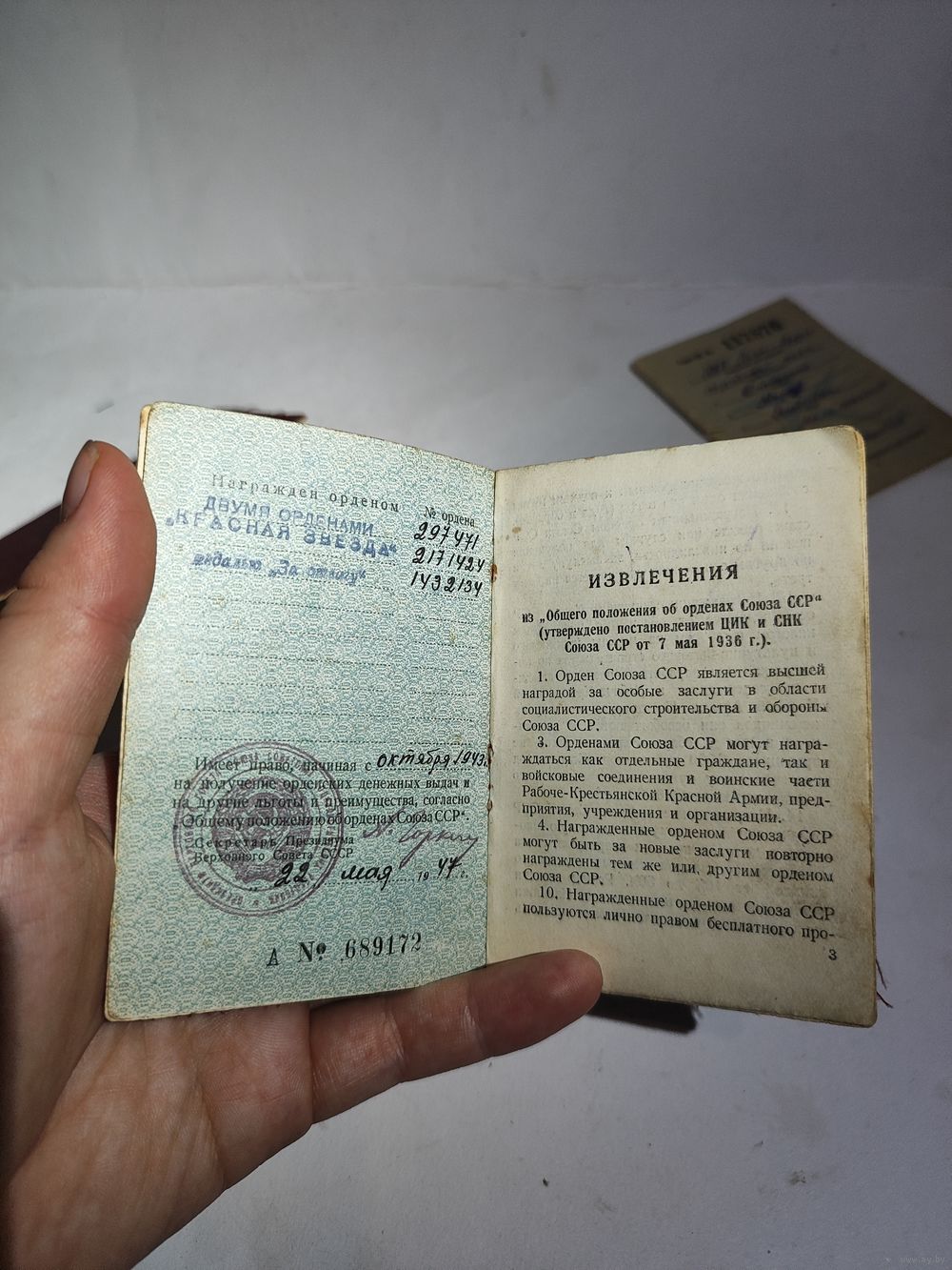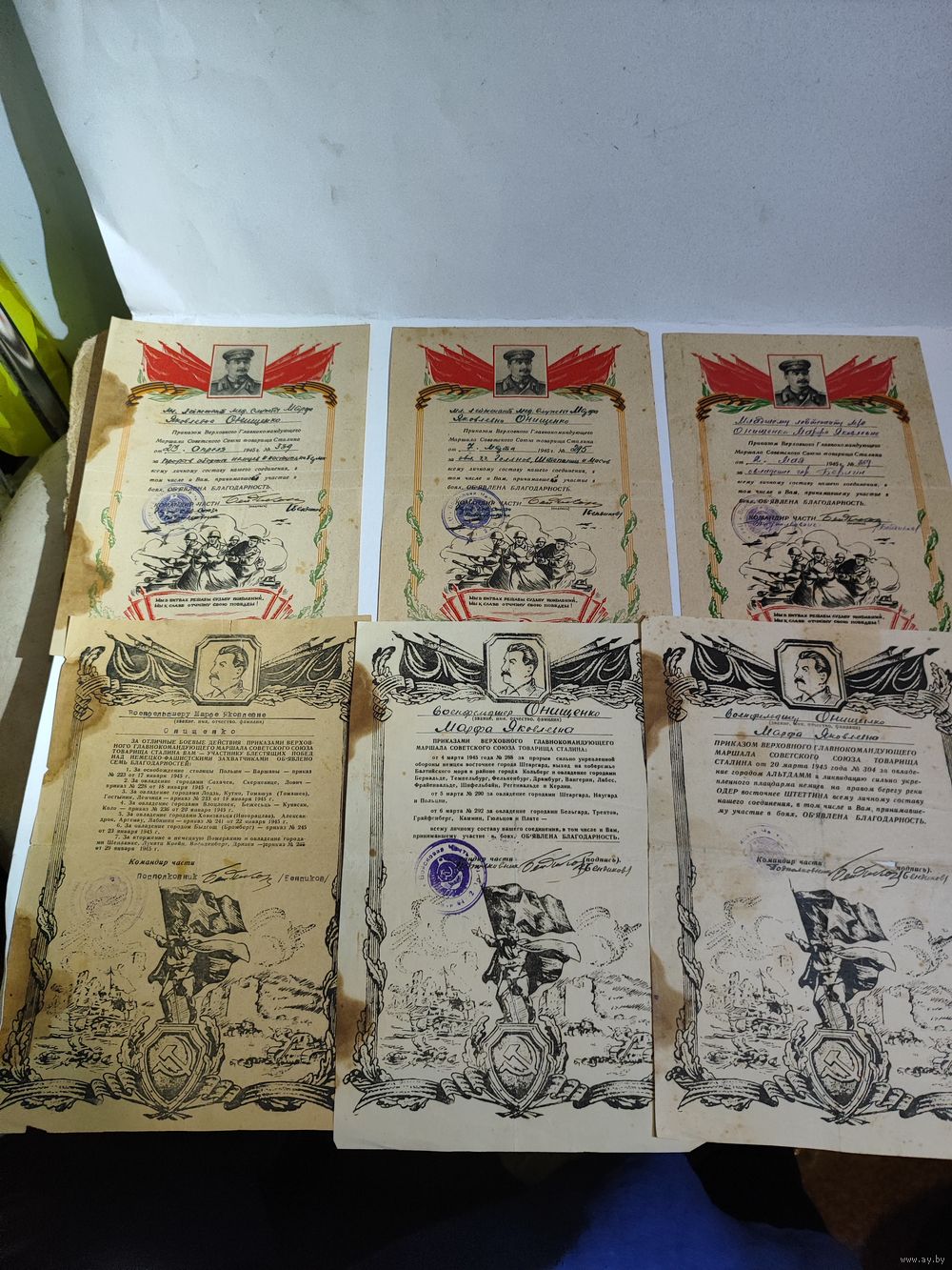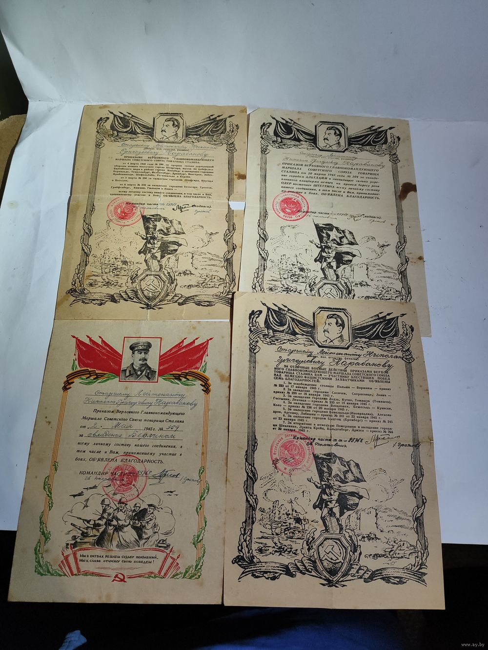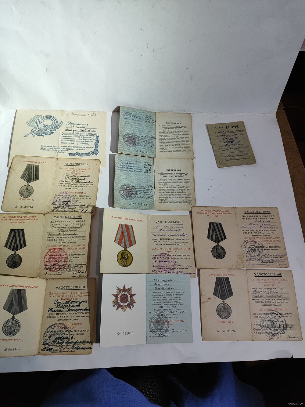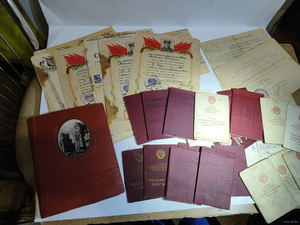 Документы и удостоверения на мужа и жену (есть справка.)+ удостоверение жены за Варшаву и красноармейская книга(не попадает на фото)+ благодарности +папка в которой хранились документы (Белорусское товарищество культурной связи с заграницей.-надпись внутри). Редкая орденская книжка (мужа на красное знамя , диапазон-"ласточкин хвост"и 2 отечка диапазон-без клейма ,номер штихель) и т.д... Повестка жены о получении медали за оборону Киева-1962г... Две справки жены (фельдшера и что проживала с мужем в Советской оккупационной зоне)...Приглашении жны на награждение юбилейной отечкой- 1ст. Две выписки из приказа о награждении мужа охотничьим ружьём (27.12.45 г.) и мотоциклом ( 30.08.45г.)... Дополнительные фото могу скинуть на вайбер. Состояние на фото.