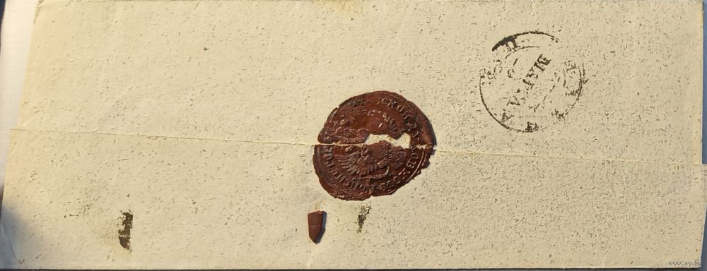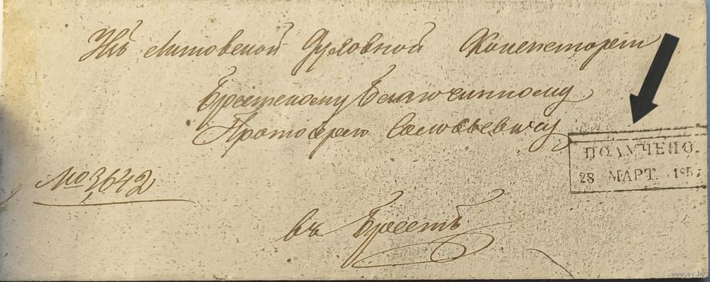 Домарочное почтовое отправление (обкладка). Отправлено из г. Вильно в г. Брест Брестскому Благочинному Протоиерею. Получено 28.03.1857г. Сургучная печать.