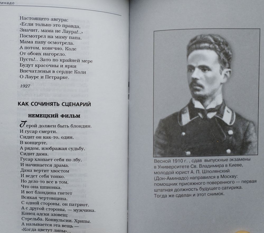 - Дон-Аминадо - такого нет в Советском Союзе! - восторженно воскликнул Бабель в 1927 году, прочитав несколько фельетонов поэта в парижской газете "Последние новости". В устах знаменитого автора "Конармии" это была высочайшая похвала, тем более что в ту пору в Советском Союзе творили и Зощенко, и Ильф и Петров, и Евгений Замятин, и Пантелеймон Романов, и Михаил Булгаков, и Владимир Маяковский, и Валентин Катаев... Однако, сделав поправку на восторженный, взрывной характер Бабеля, следует тем не менее признать, что, быть может, такого универсального юмориста-сатирика в те годы на родине не было. Он писал сатирические стихотворения и стихотворные фельетоны, великолепные тонкие, психологически точные юмористические рассказы, пьесы, юмористические миниатюры всех разновидностей, наконец - афоризмы. Он втискивал в свои произведения такое разнообразие тем (от сугубо бытовых до политических), что вполне заслуживал наименование энциклопедиста (пусть и юмористического). И под конец жизни выпустил книгу мемуаров "Поезд на третьем пути", которая несомненно останется в русской литературе как яркий и емкий портрет эмиграции, портрет эпохи.