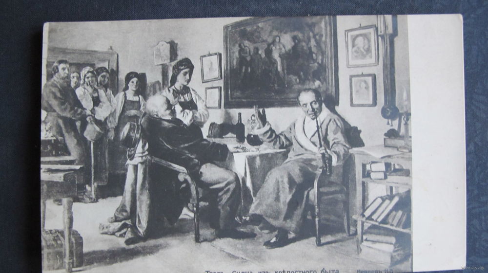 Дореволюционная почтовая карточка с картиной Н.Неврева "Торг. Сцена из крепостного быта"
