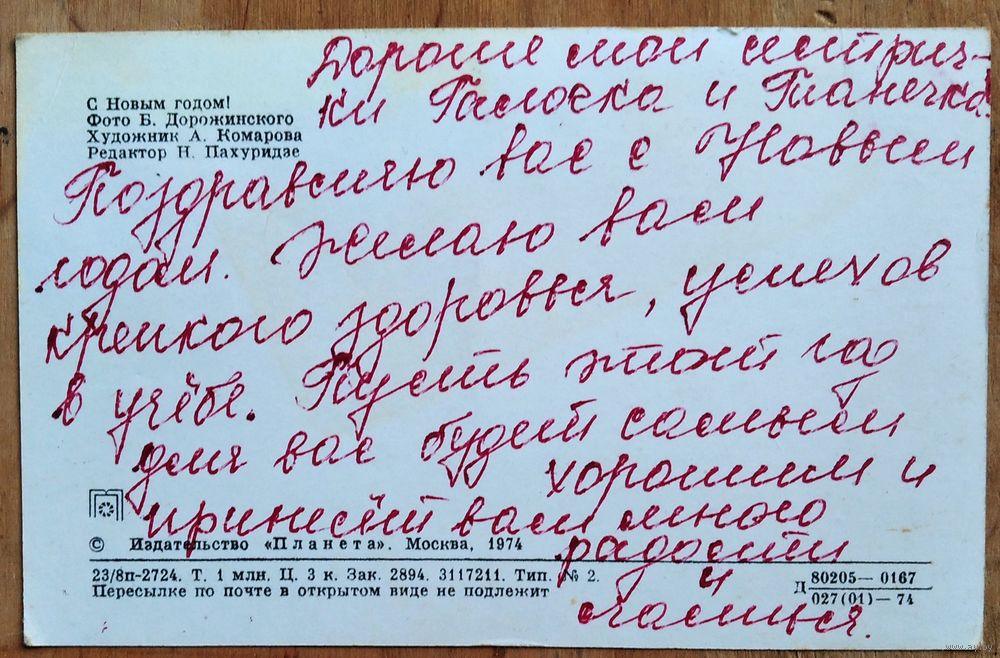 Дорожинский Б. Комарова А. С Новым годом! 1974 г. Подписана.
