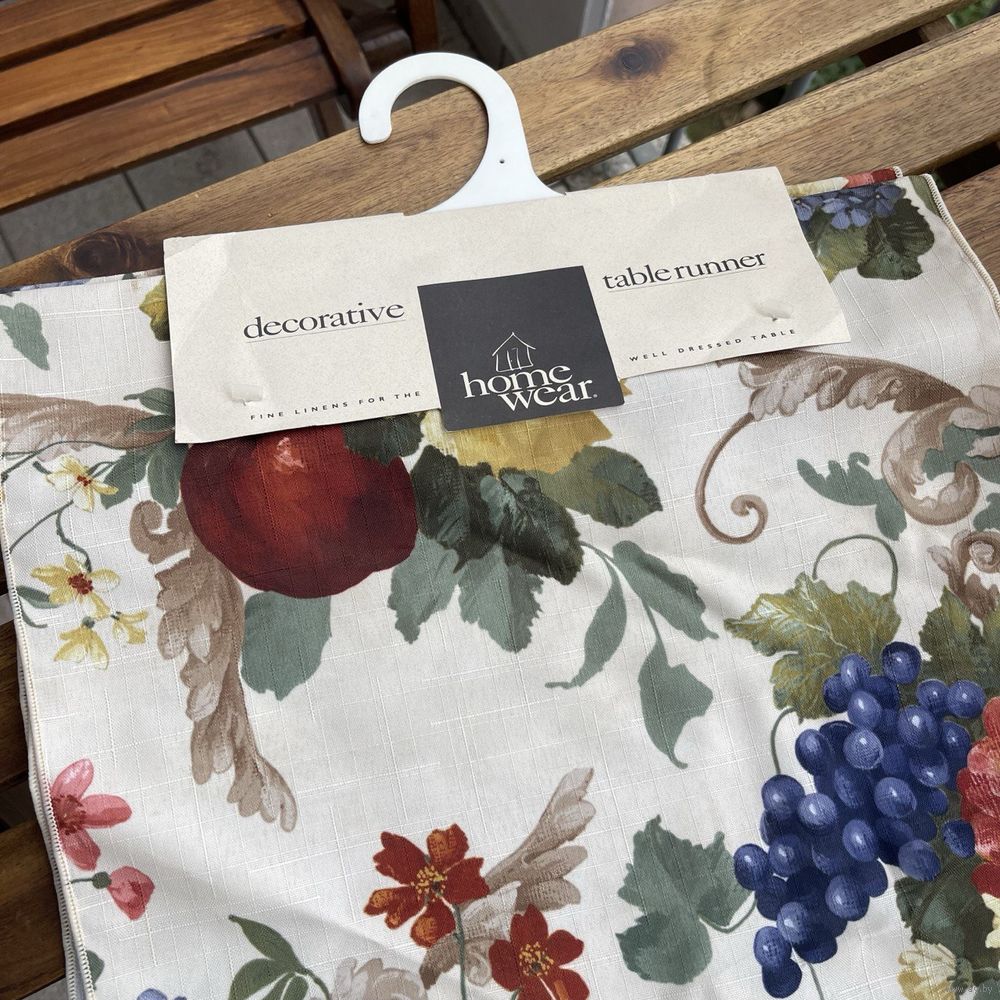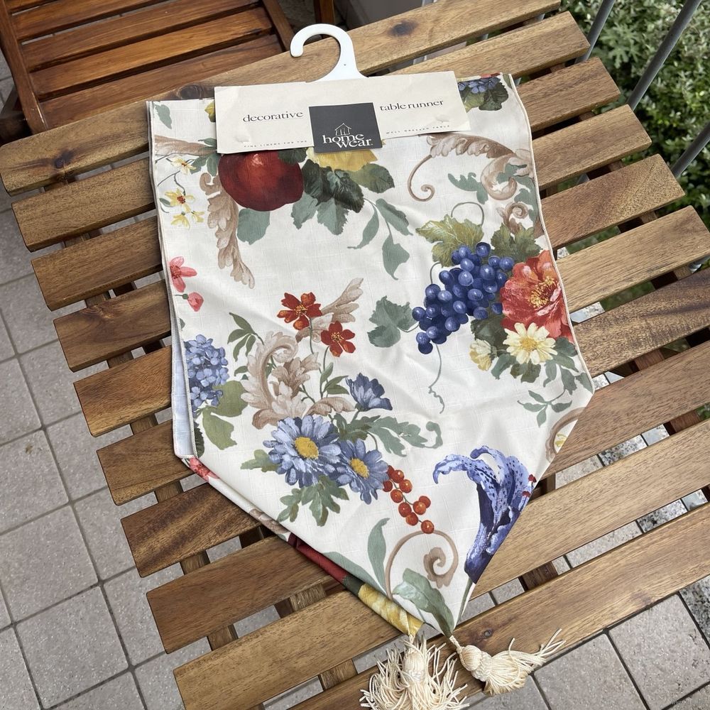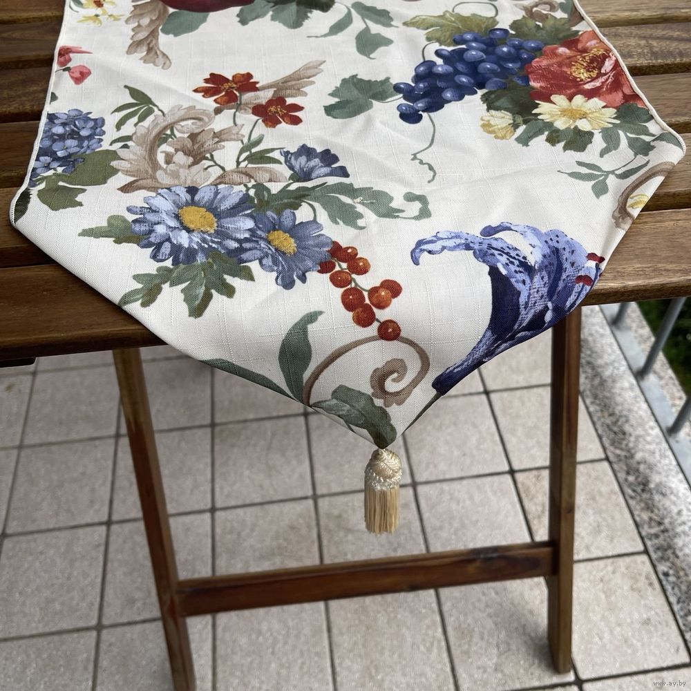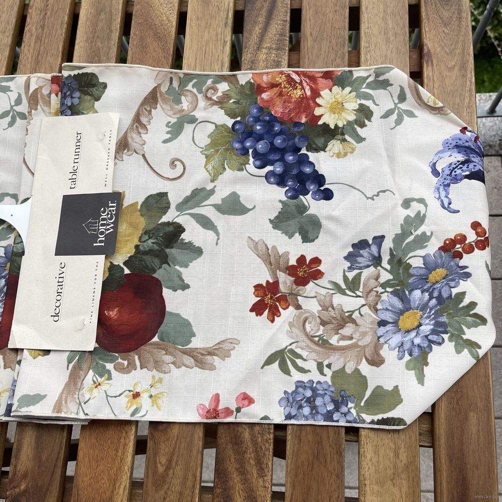 Винтажная настольная дорожка, раннер с ярким цветочно-виноградным принтом и кисточками на концах. США. 1980-е г.г. Размер 180 х 36 см. 100% полиэстер. Новый, в упаковке. Без пятен, пыльный в результате длительного хранения, необходима стирка.