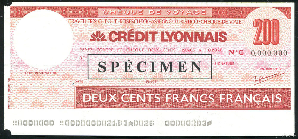 Дорожный чек 200 франков Образец Банк Credit Lyonnais Франция
