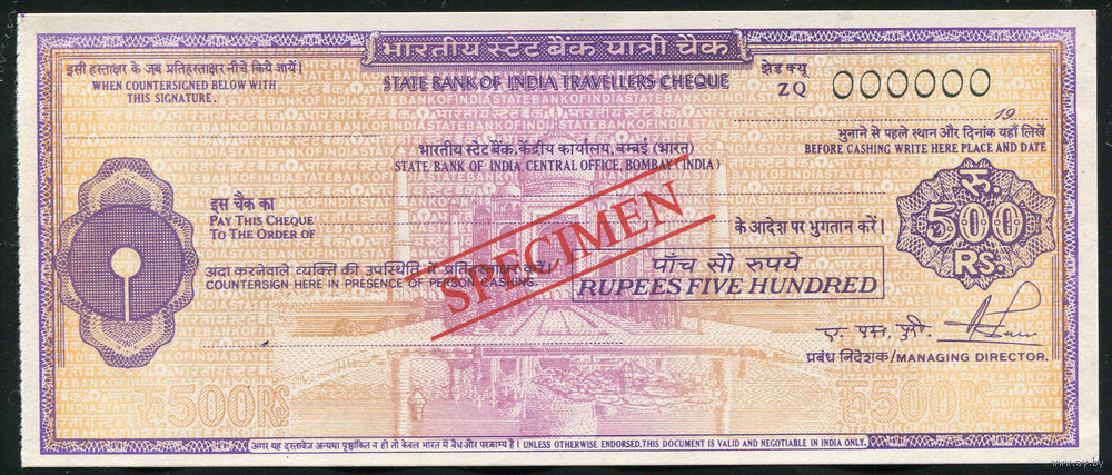 Дорожный чек 500 рупий Образец Bank of India Индия