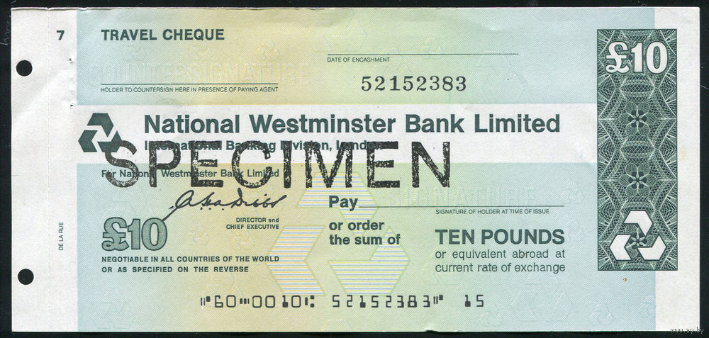 Дорожный чек Образец 10 фунтов стерлингов Банк Westminster Bank