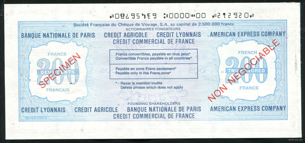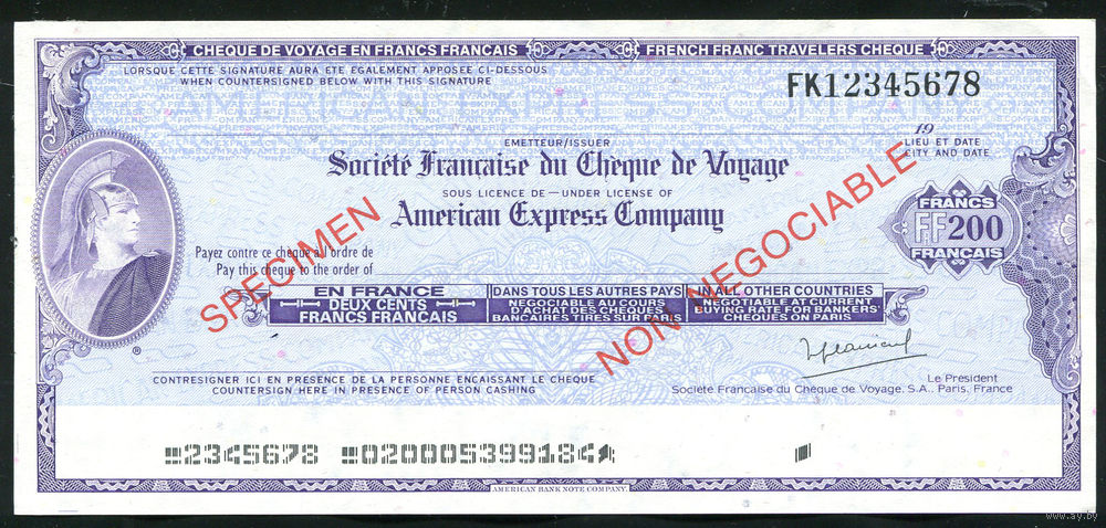 Дорожный чек Образец 200 франков Банк Societe Francaise Франция